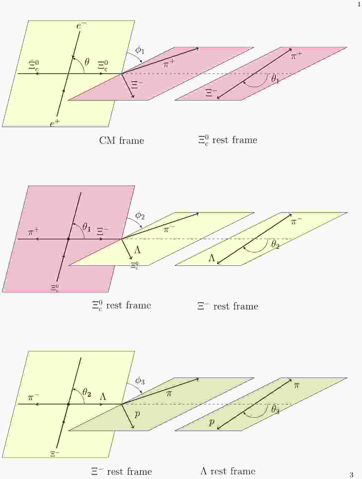 $e^{+} e^{-} \rightarrow \Xi_c^{0} \bar{ \Xi}_c ^{0},\Xi_c^{0} \rightarrow \Xi^{-}\pi^{+}, $ $ \Xi^{-} \rightarrow\Lambda \pi^{-},\Lambda \rightarrow p \pi $ , and$ \bar\Xi_c^0 $ decaying into anything. The first two decay chains have been encoded in the$ \Xi^- $ spin density matrix, and thus allow us to construct the complete decay amplitude beginning with the$ \Xi^- $ decay. Helicity amplitudes for$ \Xi^- $ and$ \Lambda $ decays are given in Table 1, and their decay asymmetry parameters are denoted by$ \alpha_{\Xi} $ and$ \alpha_\Lambda $ , respectively, defined by$\alpha_\Xi = (|G_{1/2}|^2-|G_{-1/2}|^2)/ $ $ |G_{1/2}|^2+|G_{-1/2}|^2, $ and$\alpha_\Lambda = (|F_{1/2}|^2-|F_{-1/2}|^2)/|F_{1/2}|^2+ $ $ |F_{-1/2}|^2 $ . Helicity angles, ($ \theta_2,\phi_2 $ ) for$ \Xi^-\to\Lambda\pi^- $ and$ (\theta_3,\phi_3) $ for$ \Lambda\to p\pi^- $ , are illustrated in Fig. 1. Subsequently, the joint angular distribution for the full decay chain is calculated by$ \begin{split} {\cal W}&(\theta,\theta_1,\theta_2,\theta_3,\phi_1,\phi_2,\phi_3) \propto \displaystyle\sum _{\lambda_i,\lambda_j = \pm \frac{1}{2}} \rho^{\Xi}_{\lambda_2,\lambda_2'}(\theta,\theta_1,\phi_1)\\ &\times D_{\lambda_2,\lambda_3}^{\frac{1}{2}}(\phi_2,\theta_2,0)D_{\lambda_2',\lambda_3'}^{\frac{1}{2}*}(\phi_2,\theta_2,0) \\ &\times D_{\lambda_3,\lambda_4}^{\frac{1}{2}}(\phi_3,\theta_3,0)D_{\lambda_3',\lambda_4}^{\frac{1}{2}*}(\phi_3,\theta_3,0) \\ &\times G_{\lambda_3}^*G_{\lambda_3'}|F_{\lambda_4}|^2. \end{split} $