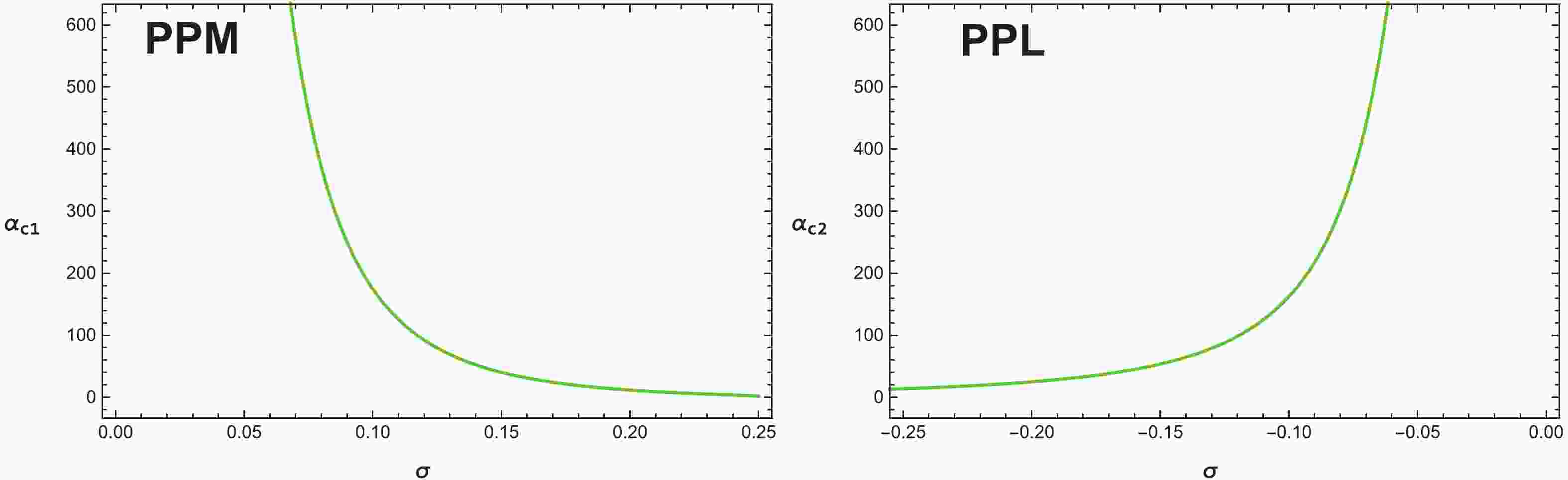 $\sigma$ at$M = 0.5$ . The photon sphere radius occurs only in the system when$\alpha$ $<\alpha_{c1}$ for the PPM and$\alpha$ $>\alpha_{c2}$ for the PPL, respectively.