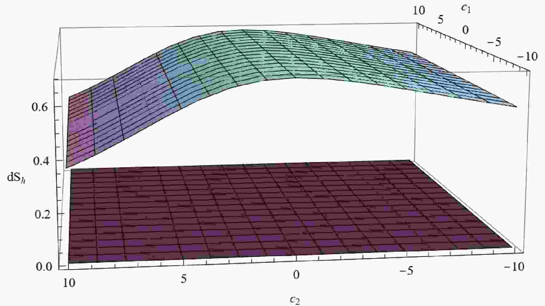 ${\rm d}S_h$ remains positive for any$ c_i(i = 1,2) $ . We plot the relation between${\rm d}S_h$ and the values of$ c_i $ in Fig. 1. It can be seen that the value of${\rm d}S_h$ always exceeds zero. More explicit relations between${\rm d}S_h$ and$ c_1,c_2 $ are shown in Fig. 2.