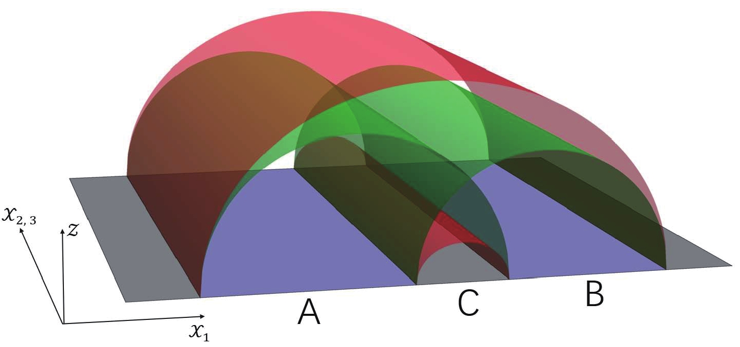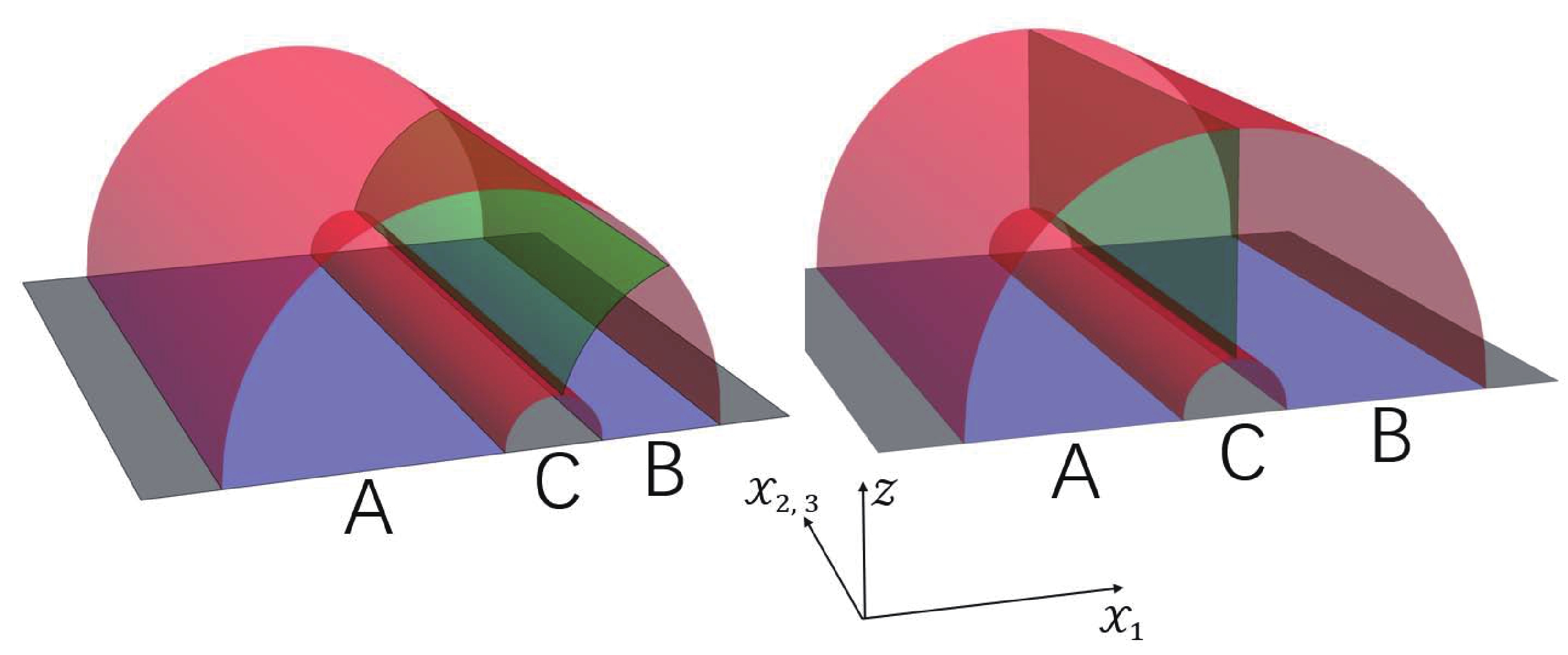 where ${\rm Area}(\Sigma_{\rm gre})$ (${\rm Area}(\Sigma_{\rm red})$) represents the area of the green (red) surfaces as shown in Fig. 10. The green surfaces are the R-T surfaces of $ A\cup C $ and $ B\cup C $, and the red surfaces correspond to the R-T surfaces of $ A\cup B\cup C $ and C.
