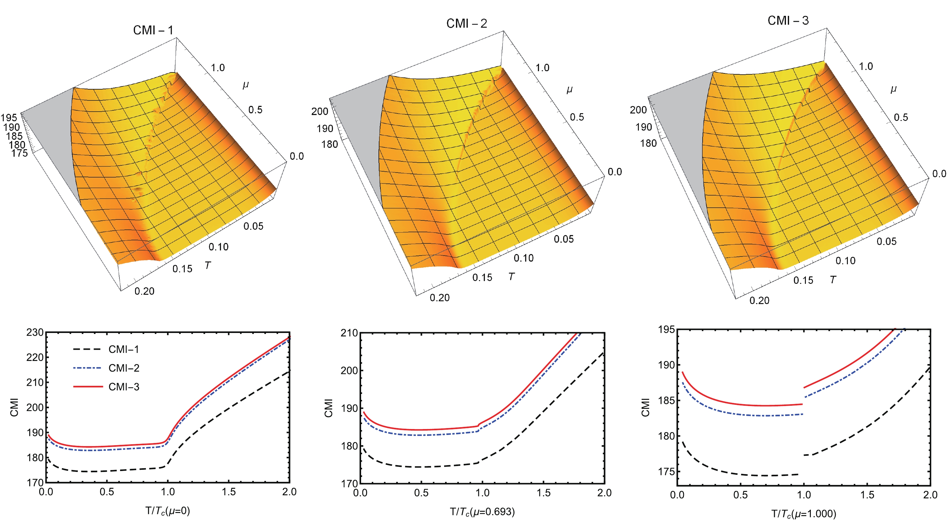 For the conditional mutual information, we also consider the same regions A and B as given in Table 1. Fig. 11 shows the 3D-plot of $ CMI(A,B|C) $ on the (T, $ \mu $) phase diagram and its 2D-plot along a fixed $ \mu $.