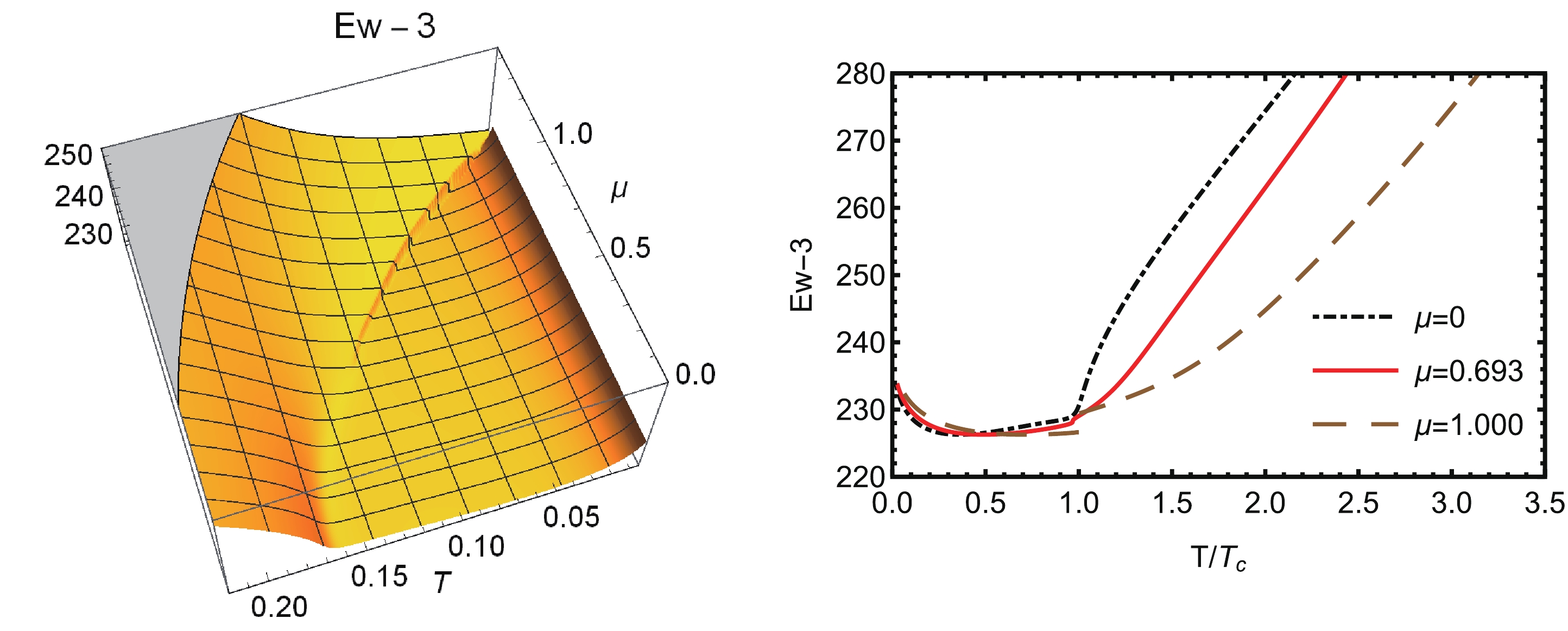 In this section, we only consider the symmetric case of A and B (case-3 in Table 1). The minimal surface is the surface with $ x_1 = const $ as shown in the right sub-figure in Fig. 12. The asymmetric case of A and B is potentially much more complicated, and we may consider it in our next work. Fig. 13 shows the 3D-plot of $ Ep(A,B) $ on the (T, $ \mu $) phase diagram and its 2D-plot along a fixed $ \mu $.