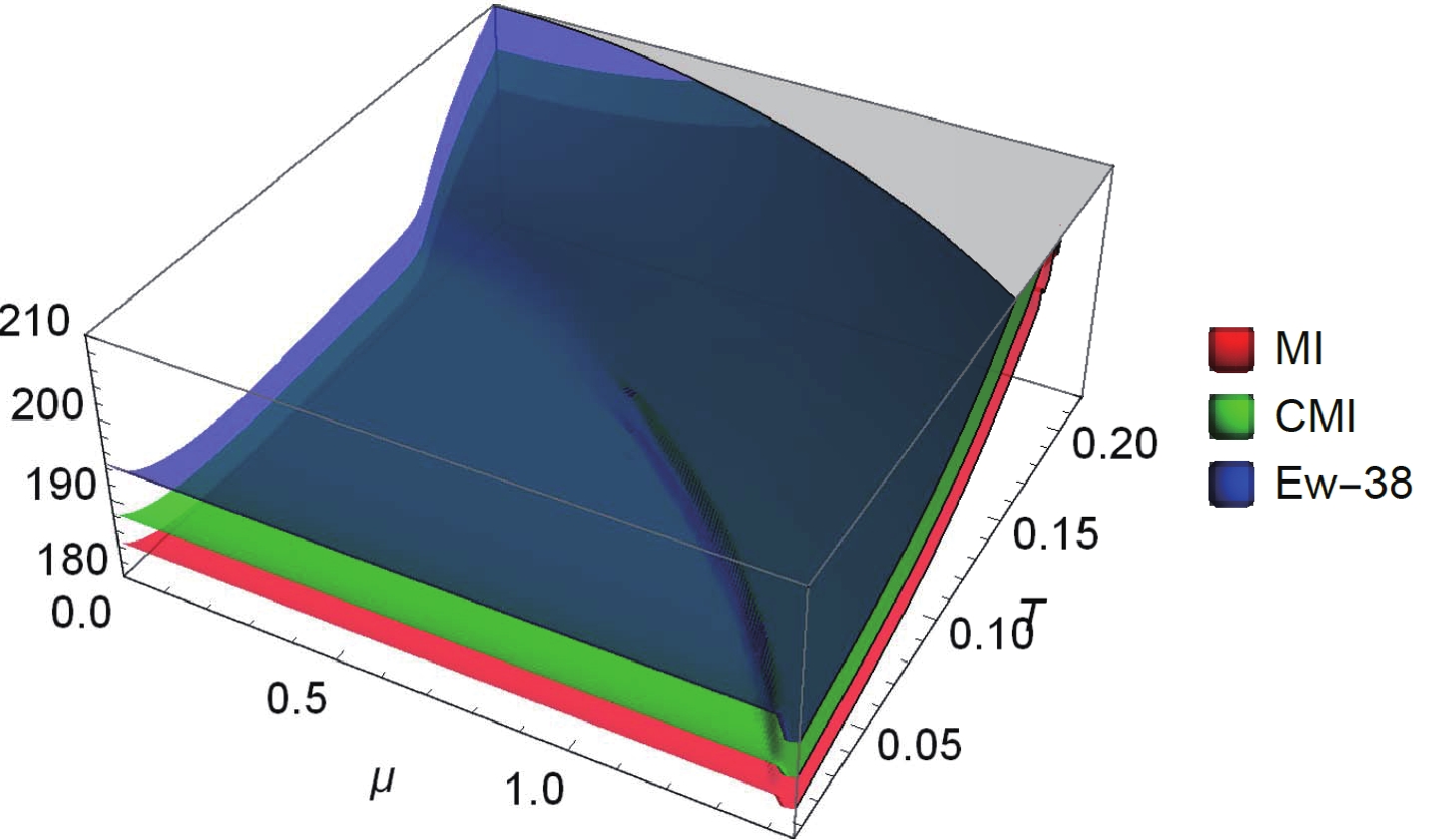In [9], the authors propose that $ Ew(A,B) $ could be equal to the mutual information if a group of bit flow related to the mutual information is introduced, which can be limited within the entanglement wedge and ends on A and B. Moreover, in [27, 28] the authors suggested that $ Ep(A,B) $ should be the holographic duality of the entanglement of purification of A and B. The 3D-plot in Fig. 13 shows a very similar behavior of $ Ep(A,B) $ to $ MI(A,B) $ and $ CMI(A,B|C) $, as shown in Fig. 9 and Fig. 11. These similarities could also be observed in Fig. 14, where we plot the $ MI(A,B) $ (red plot), $ CMI(A,B|C) $ (green plot), and $ Ep(A,B)-38 $ (blue plot). It should be noted that, to compare these three entanglement quantities, we only consider the symmetric case of A and B (case-3 in Table 1). It is evident in Fig. 14 that for fixed T and $ \mu $ $ Ep(A,B)\geqslant CMI(A,B|C)\geqslant MI(A,B) $. The second "$ \geqslant $" is due to the monogamy of the mutual information. If we consider the mutual information of A, B, and C, we have