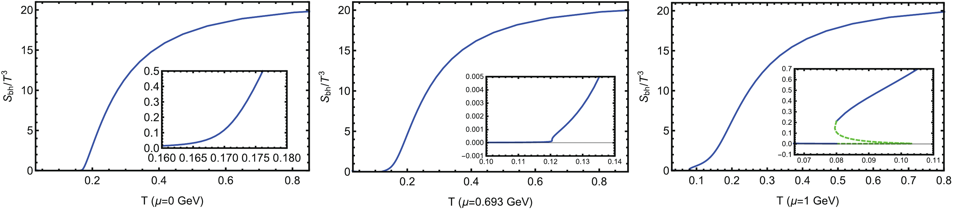 Figure 4.  (color online) The scaled black hole entropy $S_{bh}/T^3$ as a function of temperature for different quark chemical potentials. The blue solid lines are the physical black hole entropy from the minimal of the free energy. At $\mu = 0$ , phase transition occurs at $T = 0.17\; {\rm GeV}$, and it is a crossover, so $S_{bh}$ is single valued and smooth. When $\mu = 0.693\; {\rm{GeV}}$, it is the critical endpoint of the first order phase transition and the transition temperature is $T = 0.121\; {\rm{GeV}}$ , where$S_{bh}$ is single valued but not smooth. For $\mu = 1\; {\rm{GeV}}$, the first order phase transition occurs at $T = 0.08\; {\rm{GeV}}$ for which $S_{bh}$ is not single valued, and the physical value of $S_{bh}$ is not continuous at this point.