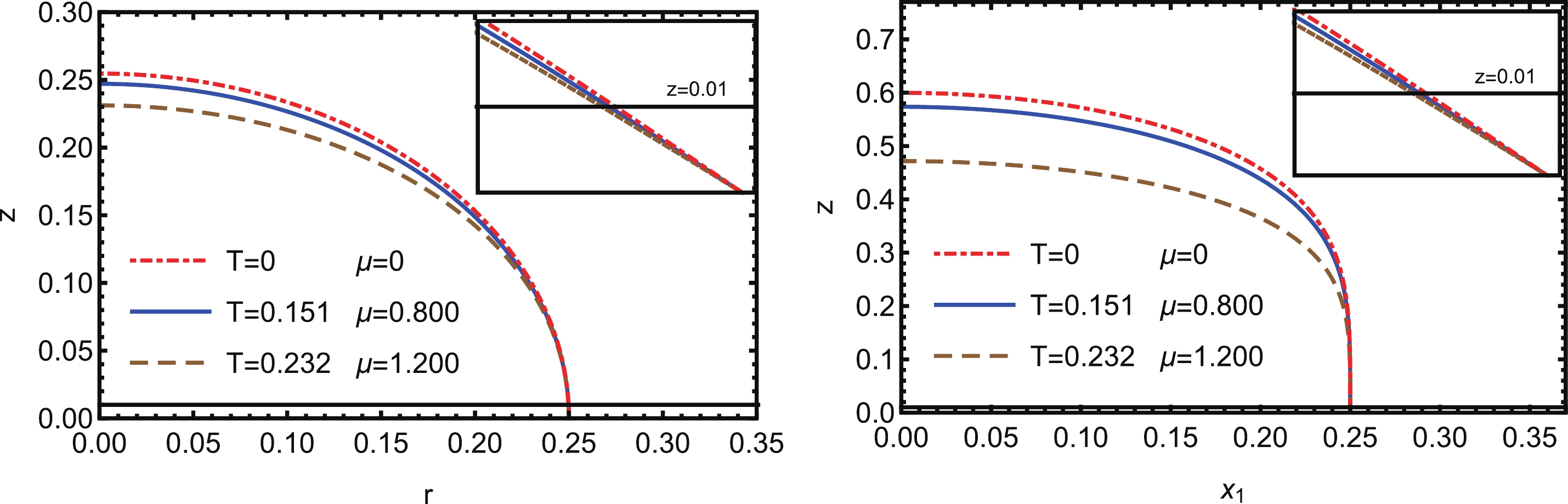 Figure 5.  (color online) The minimal surface with a UV-cutoff at $z = 0.01$ ${\rm{GeV}}^{-1}$ for different temperatures and baryon chemical potentials. (Left) The minimal surface for a spherical shaped region A. (Right) The minimal surface for a strip shaped region A. In this case, the unit for the temperature and the chemical potential $\mu$ is ${\rm{GeV}}$.