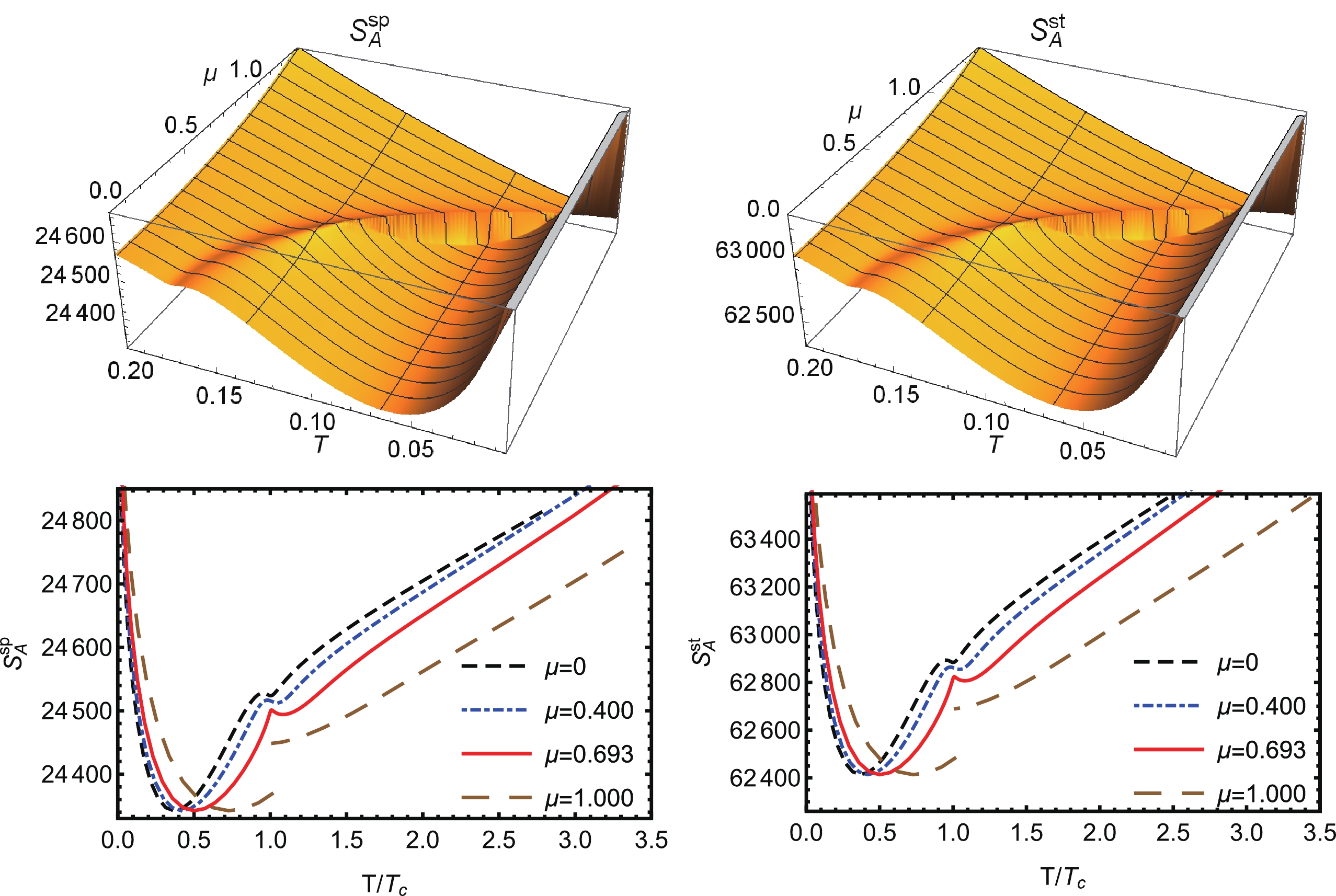 • Before we show the entanglement entropy on the QCD phase diagram, we first calculate the black hole entropy for different temperatures, T, and the baryon chemical potential, $ \mu $. We initially fix the constant $ \kappa^2 = 1 $ in the following calculation. In this case, we choose the divergent term to be