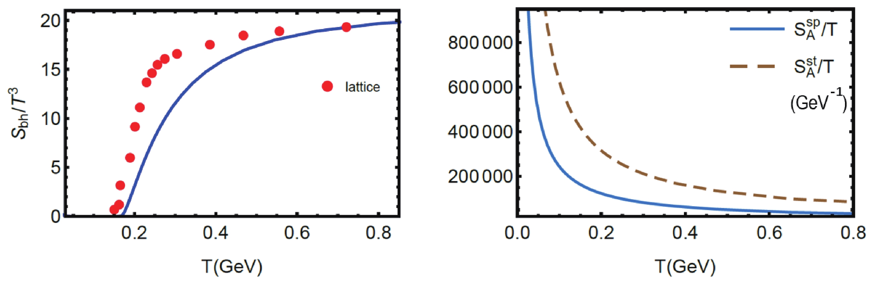 Figure 7.  (color online) The behavior of black hole entropy and entanglement entropy at high temperatures with $\mu = 0$. (Left) The red dots are the lattice data [34] of thermal entropy, and the blue solid line is the black hole entropy in our holographic QCD model. (Right) $S_A^{sp}/T$ and $S_A^{st}/T$ at $\mu = 0$.