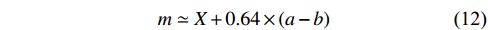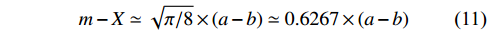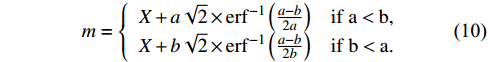 $ m = \left\{ {\begin{array}{*{20}{l}} {X + a\sqrt 2 \times {\rm{er}}{{\rm{f}}^{ - 1}}\left({\frac{{a - b}}{{2a}}} \right)}&{{\rm{if}}\;{\rm{a}} < {\rm{b}},}\\ {X + b\sqrt 2 \times {\rm{er}}{{\rm{f}}^{ - 1}}\left({\frac{{a - b}}{{2b}}} \right)}&{{\rm{if}}\;{\rm{b}} < {\rm{a}}.} \end{array}} \right. $