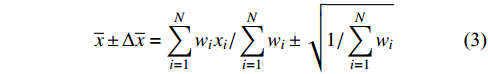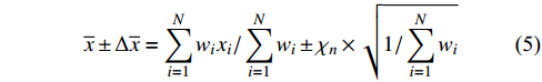 $ \overline{x} \pm \Delta\overline{x} = \sum\limits_{i = 1}^N w_{i}x_{i}/\sum\limits_{i = 1}^N w_{i} \pm \chi_n \times \sqrt{1/\sum\limits_{i = 1}^N w_{i}} $