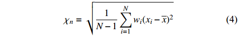 $ \chi_n = \sqrt { \frac{1}{N-1}\sum\limits_{i = 1}^N w_{i}(x_{i}-\overline{x})^2} $