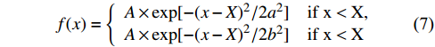 $ f(x) = \left\{ {\begin{array}{*{20}{l}} {A \times {\rm{exp}}[ - {{(x - X)}^2}/2{a^2}]}&{{\rm{if}}\;{\rm{x}} < {\rm{X}},}\\ {A \times {\rm{exp}}[ - {{(x - X)}^2}/2{b^2}]}&{{\rm{if}}\;{\rm{x}} < {\rm{X}}} \end{array}} \right. $