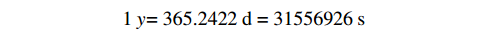 $ 1\;y {\rm{ = 365}}{\rm{.2422\;d = 31 556 926}}\;{\rm{s}} $