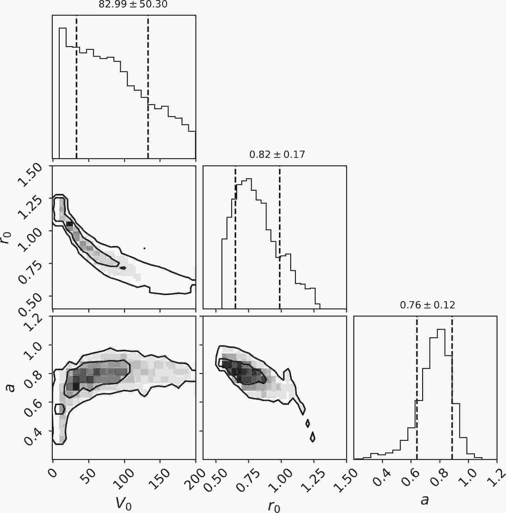 $ ^{12}{\rm{C}} $ +$ ^{12}{\rm{C}} $ fusion reaction. This figure is generated using the widely used Python package CORNER [46, 47, 54]. The expectation value of the potential parameters according to Eq. (6) by replacing the function$ S(x) $ with the potential parameters are$V_0 = $ $ 82.99^{\pm 50.30}$ MeV,$ r_0 = 0.82^{\pm 0.17} $ fm,$ a = 0.76^{\pm 0.12} $ fm. They are labeled on the top of the diagonal panel for reference. It was seen from the two-dimensional probability distribution graph that the three parameters were scattered in a large area. This was because there were few experimental energy points and large error bars. The$ S^\star $ factor was calculated with many parameter combinations that met the experimental data. We saw from the figure that the parameter range selected in this calculation covered the main probability distributions. For$ r_0 $ and a, an apparent single peak was seen from the diagonal plot, and the position of the average value was close to the peak. The 68.3% confidence intervals of these two parameters shown in the figure cover the main part of the peak. However, for$ V_0 $ , the top panel shows that its distributions were different from the other two. However, for$ V_0 $ , the top panel shows that its distributions were different from the other two. The maximum peak was outside the 1σ confidence interval, which was at$ V_0 = 10.27 $ MeV. The mean position where$ V_0 $ = 82.99 MeV was far from its maximum value.