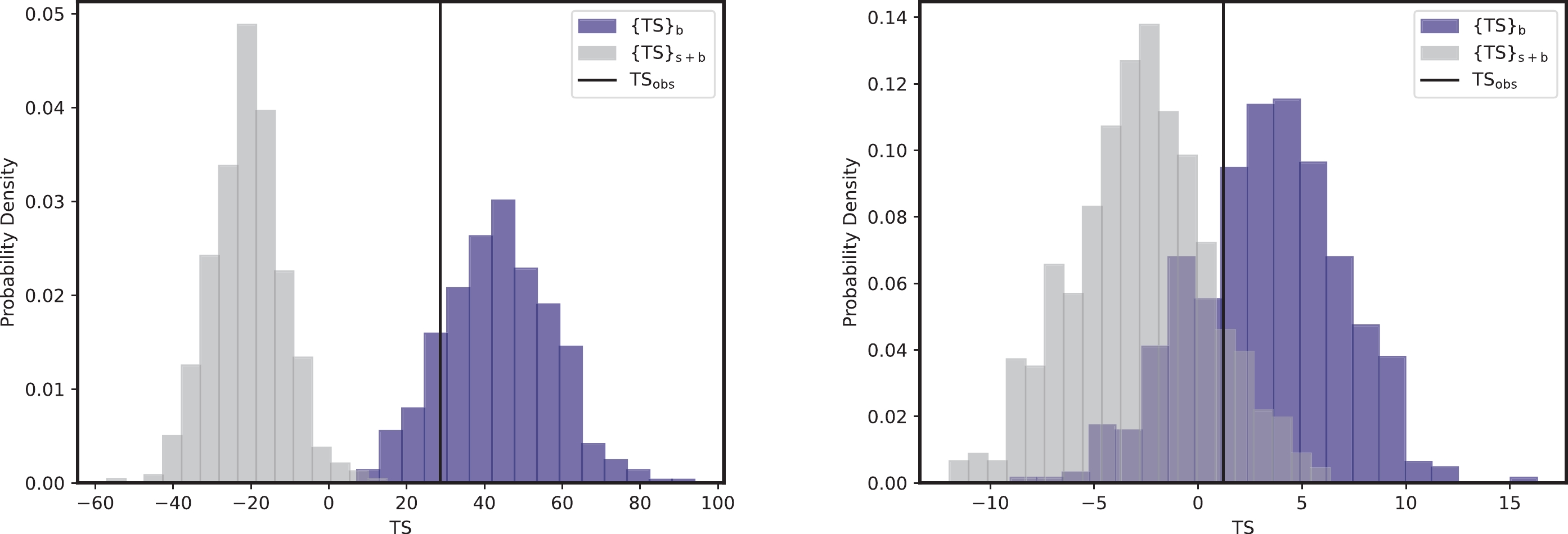 $ \{{\rm{TS}}\}_{\rm{b}} $ and$ \{{\rm{TS}}\}_{\rm{s+b}} $ for two parameter points$(m_a, g_{a\gamma})= (8\times 10^{-7}\; {\rm{eV}}, 3\times 10^{-10}\; {\rm{GeV}}^{-1})$ and$(3\times 10^{-7}\; {\rm{eV}}, 10^{-10}\; {\rm{GeV}}^{-1})$ are shown in the left and right panels, respectively. The vertical black solid lines represent$ \rm TS_{obs} $ . -