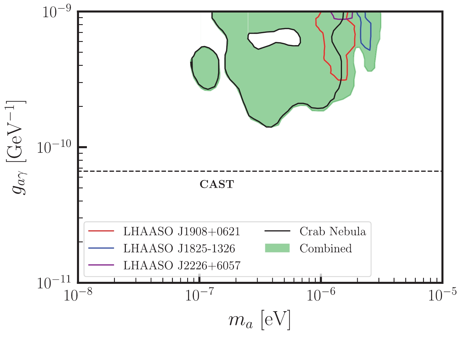 $ {\cal{O}}(1) $ TeV. In contrast, the spectra of the other sources only include the KM2A observations at energies above$ {\cal{O}}(10) $ TeV. This indicates that it is easier to precisely determine the intrinsic spectrum of the Crab Nebula and investigate the effects of ALP-photon oscillation in the Crab spectrum at lower energies. Second, the highest energy bin of the Crab spectrum reaches$ 1\; {\rm{PeV}} $ , surpassing that of the other sources. As previously mentioned, the compensation of ALP-photon oscillation to the absorption effect may be considerably more significant for higher energy photons. These characteristics enable the Crab Nebula to provide more stringent constraints.Given that the constraints from the individual sources complement each other in the parameter space, we present the combined analysis result in Fig. 3. The green region represents the combined constraint of these sources. This improves the constraints from a single source for ALP masses above