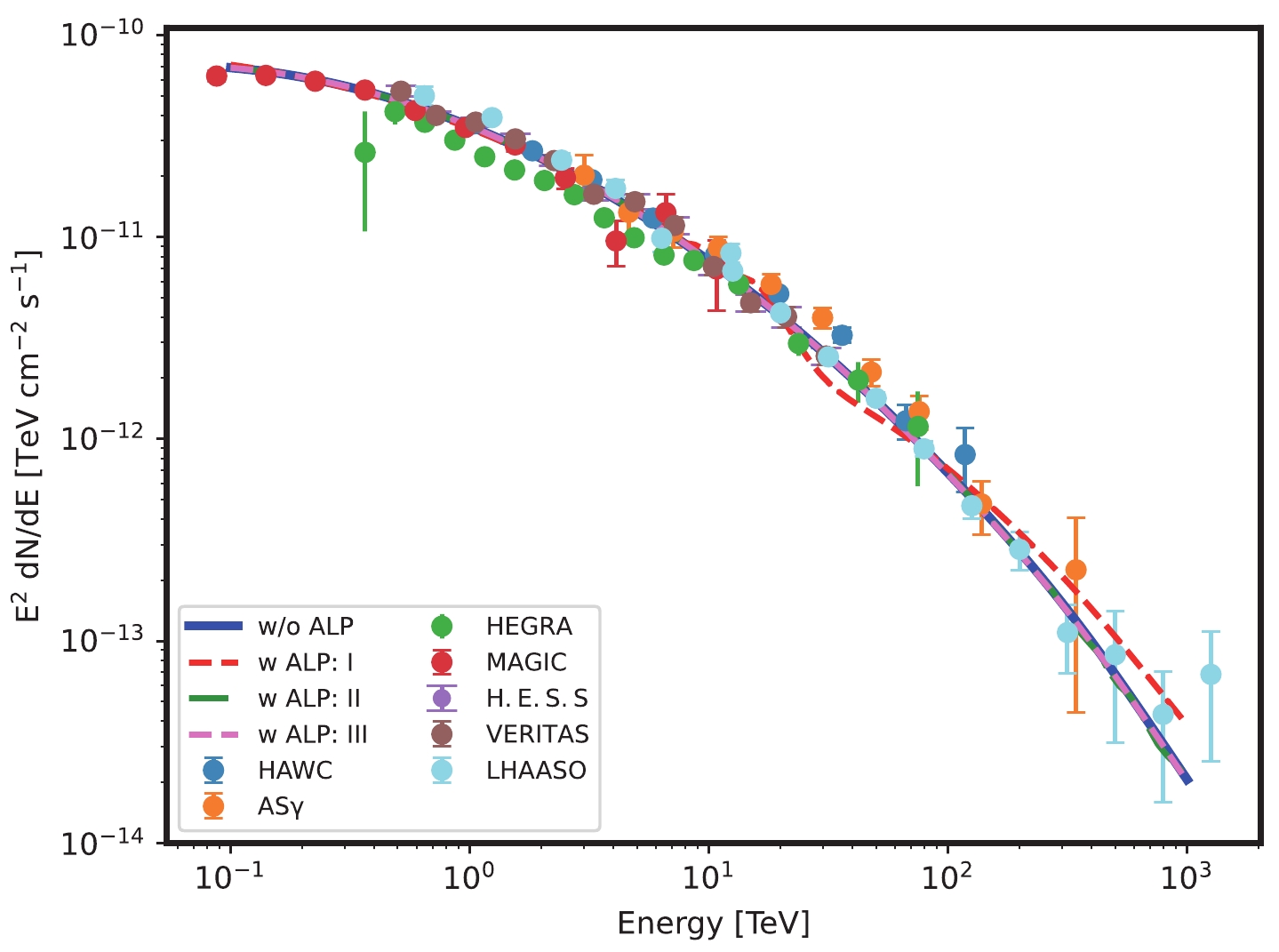 $(m_a, g_{a\gamma})= ({1\times 10^{-6}} $ $ {{\rm{eV}}, \; 1\times 10^{-9}\; {\rm{GeV}}^{-1}})$ ,$(8\times 10^{-6} \;{\rm{eV}},$ $\; 1\times 10^{-9} \;{\rm{GeV}}^{-1})$ , and$({1\times 10^{-6}} $ $ {{\rm{eV}}, \; 5\times 10^{-11}\; {\rm{GeV}}^{-1}})$ , respectively. The data points represent observations from the LHAASO [53], HAWC [65],$ {\rm{AS}}{\gamma} $ [66], HEGRA [67], MAGIC [68], HESS [69], and VERITAS [70].