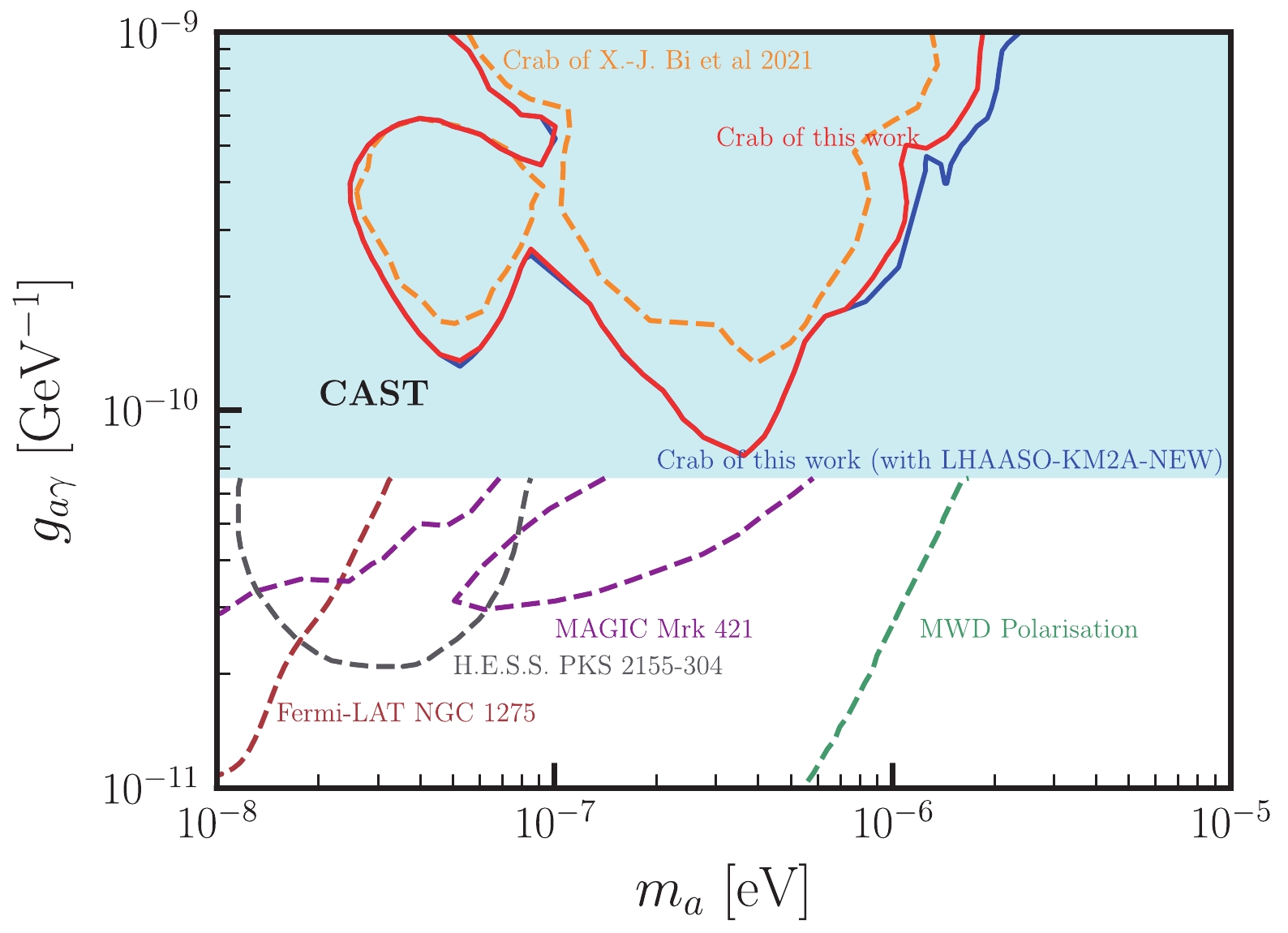 Fig. 5 shows constraints that are more stringent than the CAST constraint, including those derived from the NGC 1275 observation of Fermi-LAT [23], the Mrk 421 observation of MAGIC [33], the PKS 2155-304 observation of H.E.S.S. [18], and the polarization measurements of thermal radiation from magnetic white dwarf stars [43], for comparative purposes. It is expected that future precise measurements of the high-energy gamma-ray spectra of the LHAASO will further improve the constraints from extragalactic sources. It is important to note that although these constraints are more stringent than those derived from the high-energy Galactic sources in our study, they are contingent upon specific magnetic field models and the astrophysical environments of different sources. The constraints derived in our study are independent and hold significance.