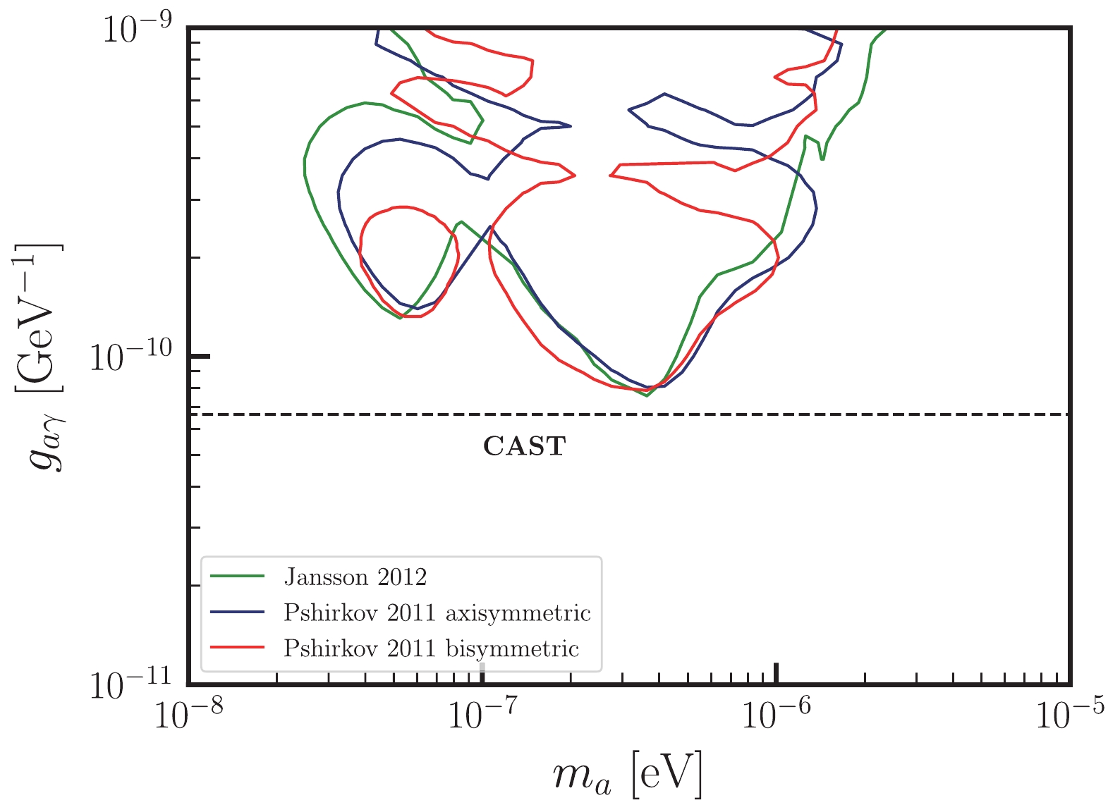 The oscillation effect between ALPs and photons is heavily reliant on the strength and structure of astrophysical magnetic fields. As a result, the main theoretical uncertainties arise from the uncertainties in the magnetic field model. In the previous analysis, we employ the Jansson & Farrar model as a benchmark Galactic magnetic field model. To investigate the impact of the Galactic magnetic field model, we conduct analyses using two alternative models, namely, the Pshirkov bisymmetric and Pshirkov axisymmetric models [82]. Our findings depicted in Fig. 6 indicate that these magnetic field models yield consistent results with our previous findings.