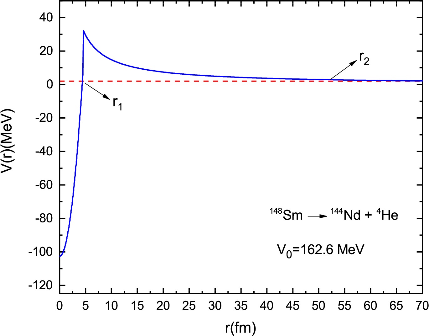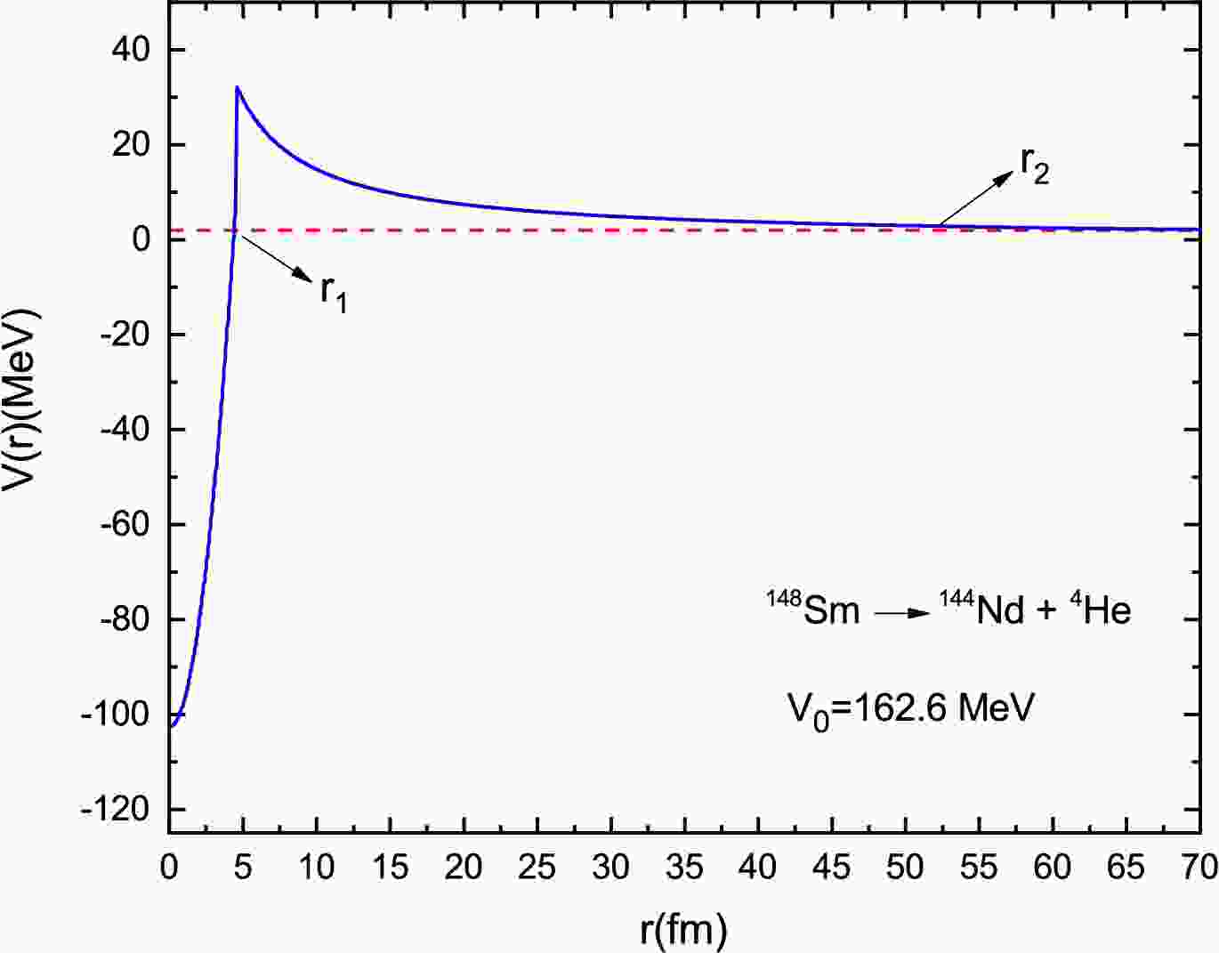 $ C_0=\dfrac{3Z_d\,Z_{\alpha}\,e^2}{2R} $ ,$ C_1=\dfrac{Z_d\,Z_{\alpha}\,e^2}{2R^3} $ , and$ C_2=Z_d\,Z_{\alpha}e^2 $ . Using$ ^{148}{\rm{Sm}} \to ^{144}{\rm{Nd}} + ^{4}{\rm{He}} $ as an example, the schematic diagram of the total interaction potential$ V(r) $ is shown in Fig. 1. Using the conditions$ V(r_1)=V(r_2)=Q_{\alpha} $ , we obtain$ r_1=\sqrt{\dfrac{Q_{\alpha}+V_0-C_0}{V_1-C_1}} $ and$ r_2=\dfrac{C_2}{Q_{\alpha}} $ .