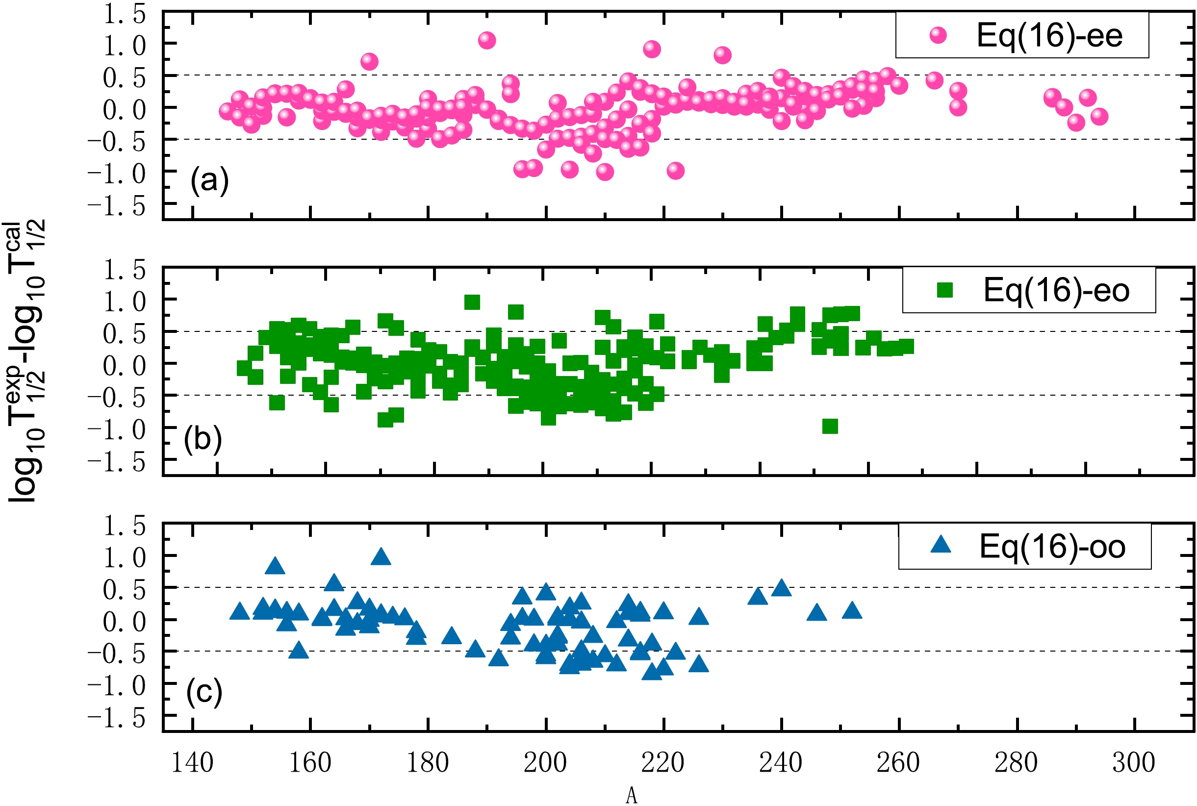 $ V_0 $ in HOPM, we use a genetic algorithm with the optimal solution of the standard deviation σ (The detailed definition of σ is given in following) as the objective function to obtain it. Fitting experimental α decay half-lives of 178 even-even nuclei, which are obtained from the latest nuclear property table NUBASE2020, we obtain the ideal value as$ V_0=162.6 $ MeV. Using the obtained$ V_0 $ , based on Eq. (16), we first systemically calculate the favored α decay half-lives. The detail results for even-even, odd-A, and odd-odd nuclei are listed in Tables 2–4, respectively. These three tables share the same frameworks, the first three columns denote the α decay, experimental α decay energy, and minimum angular momentum carried away by the emitted α particle, respectively. The fourth and fifth columns represent the experimental α decay half-lives and those calculated using the HOPM in the logarithmic form, denoted as$ {\rm{log}}_{10}{T}_{1/2}^{\rm{\,exp}} $ and$ {\rm{log}}_{10}{T}_{1/2}^{\rm{\,HOPM}} $ , respectively. These three tables show that our calculated results agree closely with the experimental data for most nuclei, with some exceptions, such as$ ^{268}{\rm{Hs}} $ ,$ ^{282}{\rm{Ds}} $ ,$ ^{185}{\rm{Pt}} $ ,$ ^{197}{\rm{Bi^{m}}} $ ,$ ^{231}{\rm{Pa}} $ ,$ ^{225}{\rm{Np}} $ ,$ ^{263}{\rm{Hs^{m}}} $ ,$ ^{196}{\rm{At^{m}}} $ , and$ ^{198}{\rm{Fr^{m}}} $ . For$ ^{268}{\rm{Hs}} $ and$ ^{282}{\rm{Ds}} $ , the deformation around the region with$ N=184 $ and$ Z=108 $ may result in large deviations for these two nuclei [78, 88, 89]. For$ ^{197}{\rm{Bi^{m}}} $ ,$ ^{263}{\rm{Hs^{m}}} $ ,$ ^{196}{\rm{At^{m}}} $ , and$ ^{198}{\rm{Fr^{m}}} $ in these excited state, the corresponding experimental data may have some uncertainty [90]. For a intuitive comparison, the differences between the experimental and calculated half-lives for even-even, odd-A, and odd-odd nuclei in the logarithmic form are plotted in Fig. 2. The figure clearly shows that the deviations between the experimental and calculated data are mostly within the range of$ \pm 0.5 $ . This means our calculated results can reproduce the experimental data well.α decay $ Q_{\alpha} $