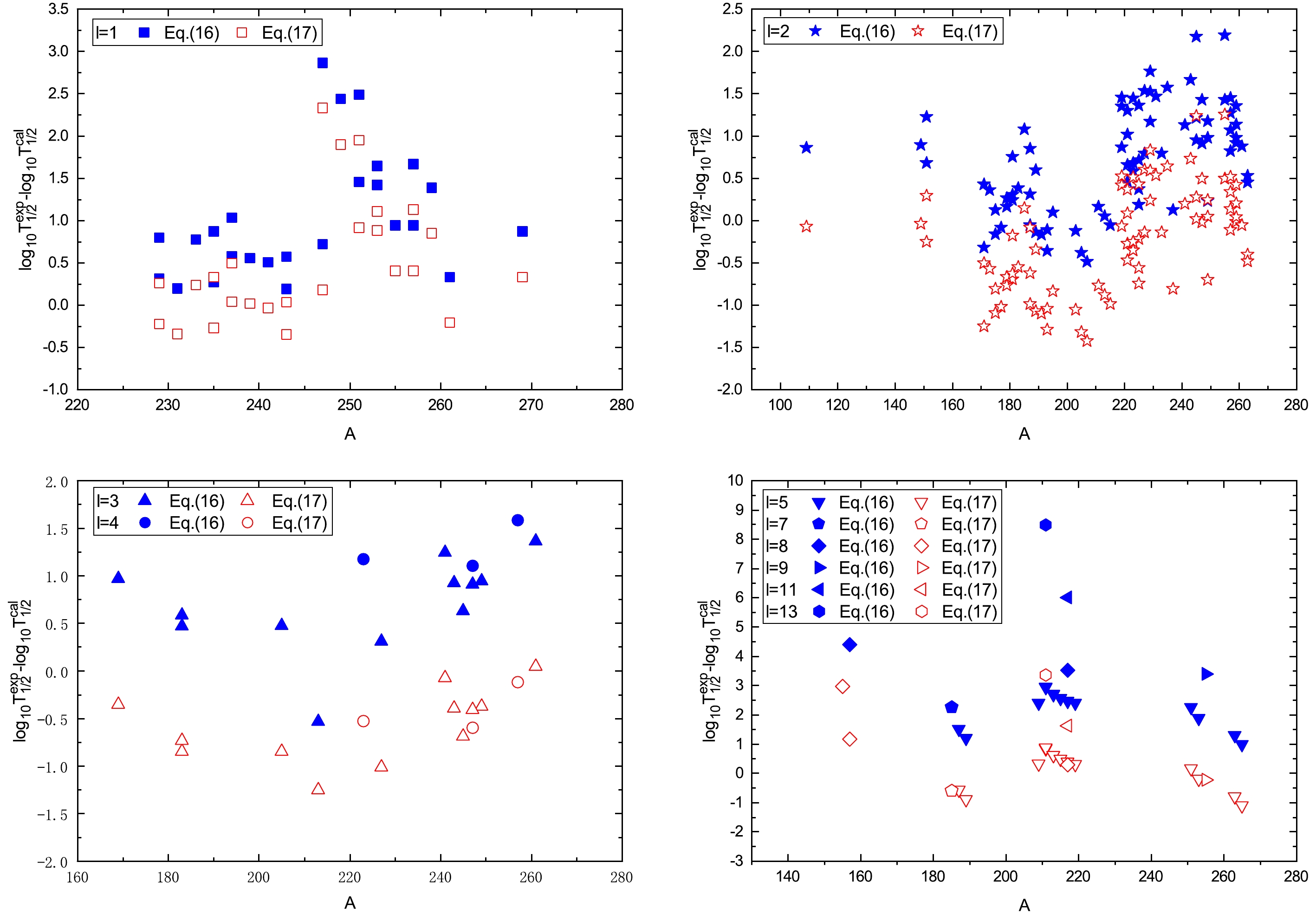 $ \begin{aligned}[b]{{\rm{log}}}_{10}T_{1/2}=\;& aZ_{\alpha}Z_d\sqrt{\mathcal{A}/Q_{\alpha}}+b\sqrt{\mathcal{A}Z_{\alpha}Z_d(A_d^{1/3}+A_{\alpha}^{1/3})}\\ & +c+d\sqrt{\mathcal{A}Z_{\alpha}Z_d(A_d^{1/3}+A_{\alpha}^{1/3})}\sqrt{l(l+1)}, \end{aligned} $