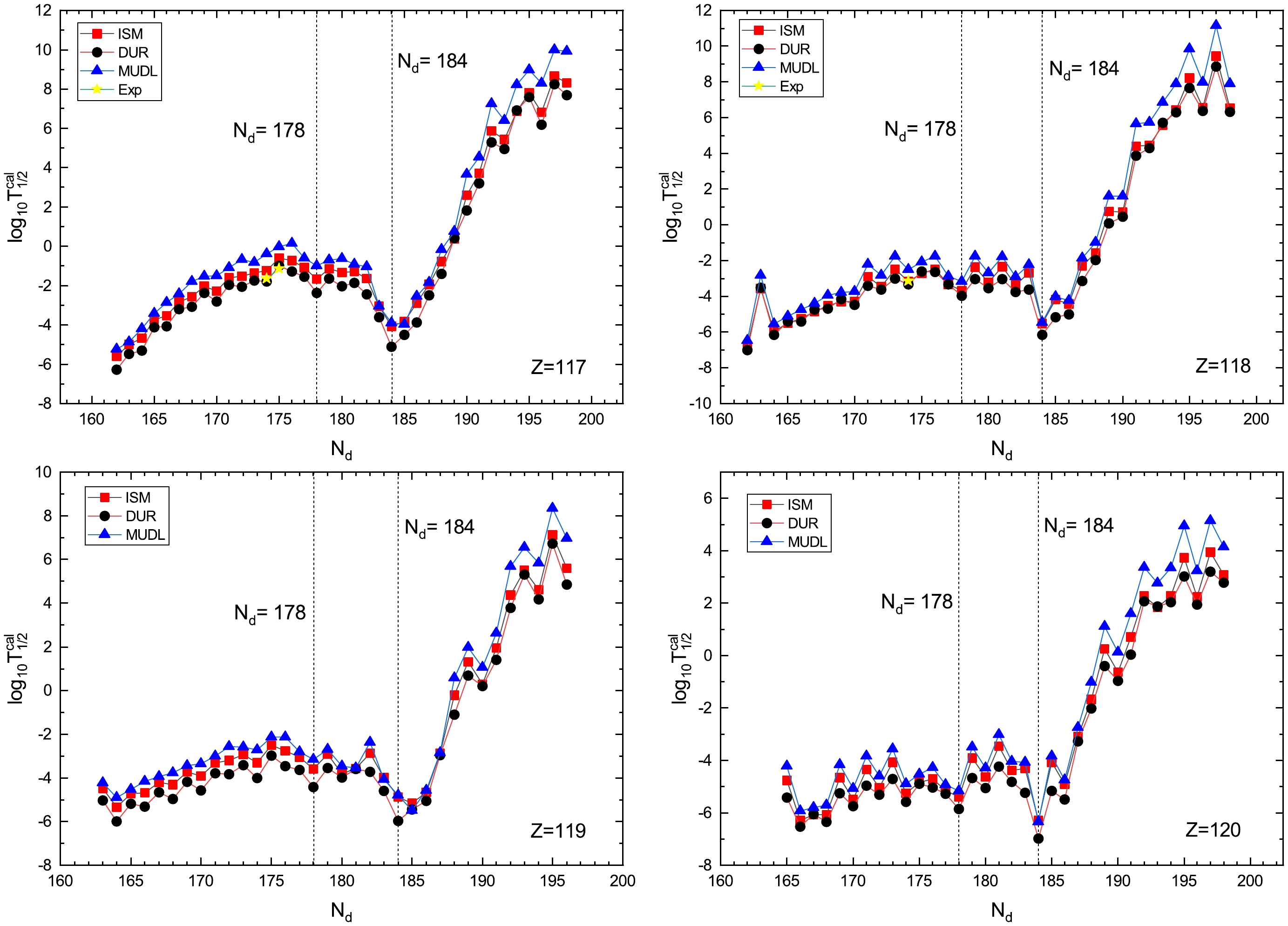 $ Z = 117,118,119 $ , and 120 using the ISM, DUR, and MUDL, with$ Q_{\alpha} $ obtained using WS3+. The red squares, green circles, blue triangles, and purple stars denote the predictions using the ISM, DUR, and MUDL, and the experimental ones, respectively. -