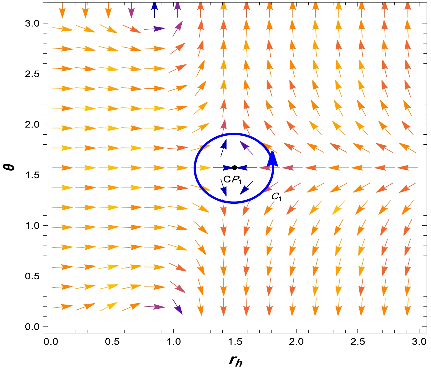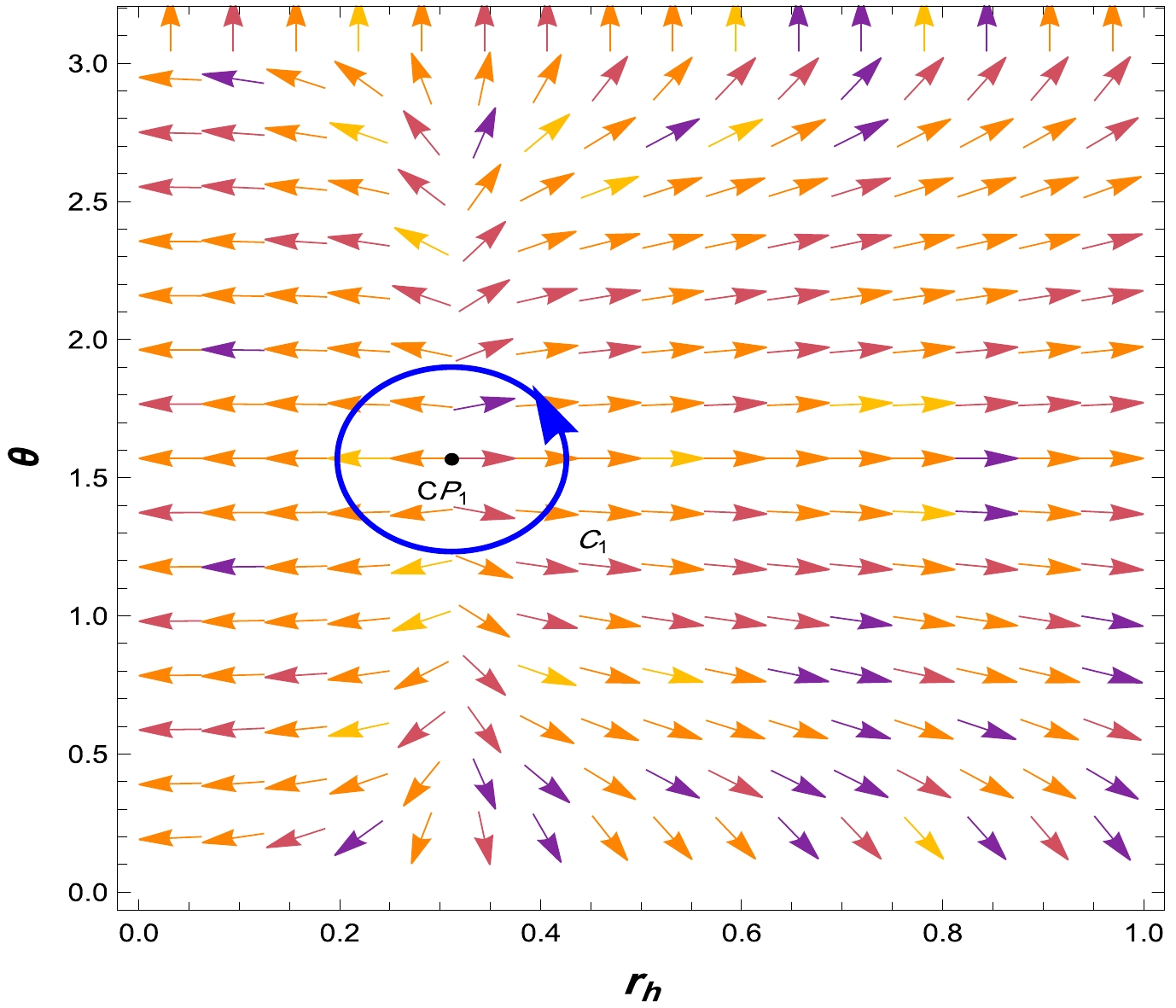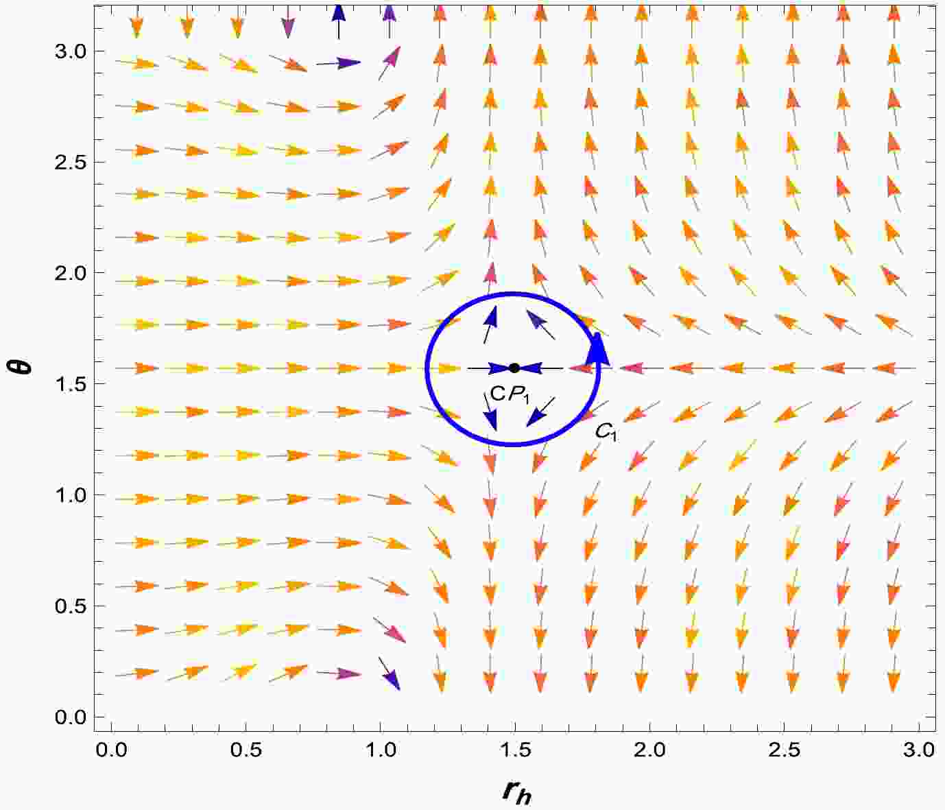 $ \phi^r=\phi^{\theta}=0 $ ), it is necessary to find its winding number$ w_i $ . For this purpose, we seek assistance from the orthogonal$ \theta-r_h $ plane. In the following discussion, we set$ P=1 $ and$ \ell=\sqrt[4]{\dfrac{3 C}{8 \pi }} $ . As shown in Fig. 1, the topological charge for the R-N AdS black hole in bulk-boundary thermodynamics is$ Q_t=-1 $ . In fact, this finding aligns with the topological charge obtained in the extended black hole thermodynamics outlined in [16]. -