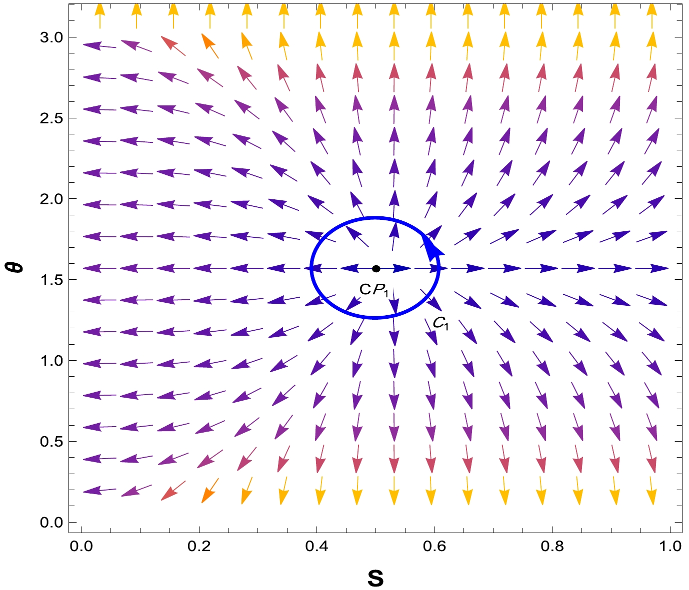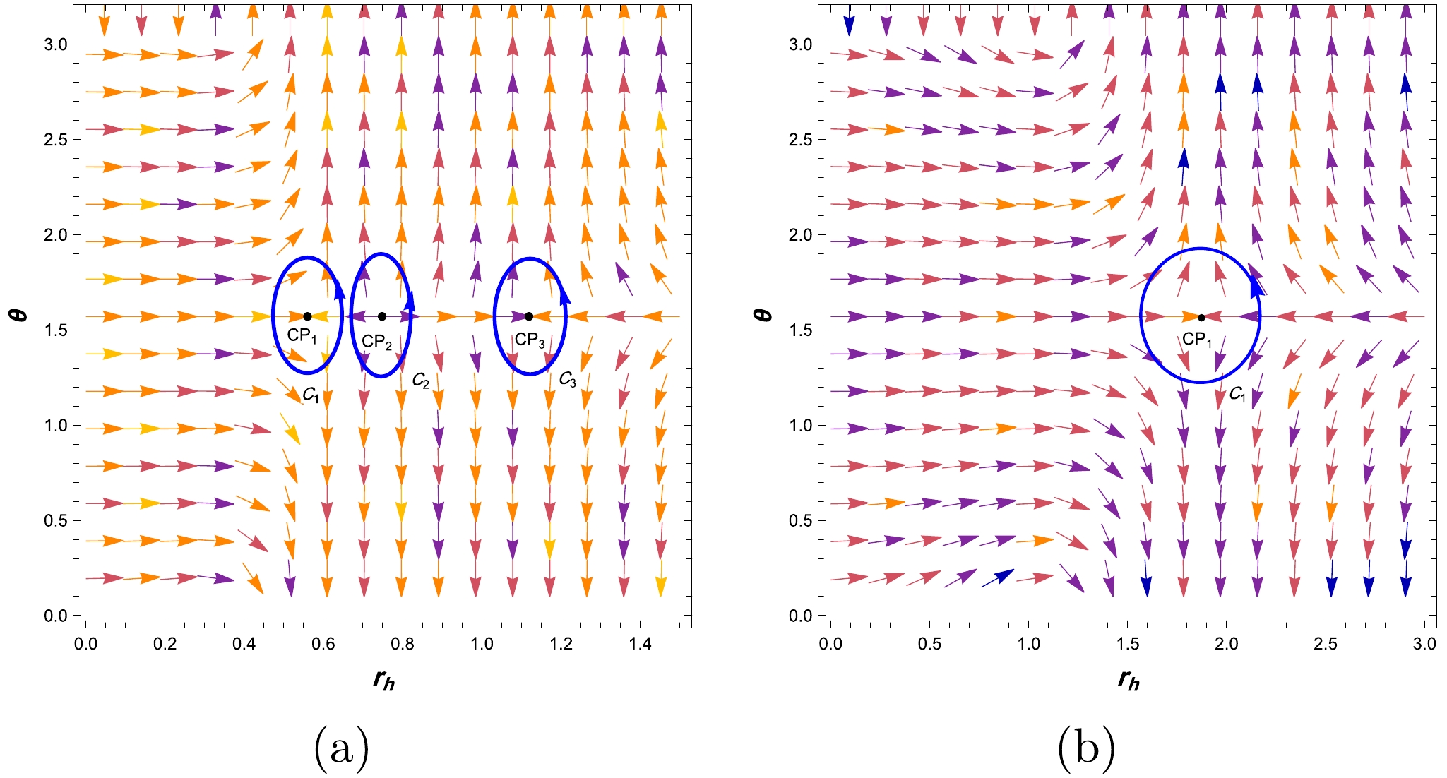 $ (S, \theta)=\left(\dfrac{C}{6},\dfrac{\pi}{2}\right) $ . The obtained result is consistent with that reported by [49]. As shown in Fig. 3, this critical point possesses a topological charge of +1$ Q_t=+1 $ . This finding contradicts [16], implying that in the RPS formalism, it results in a modification of the topological charge. -
