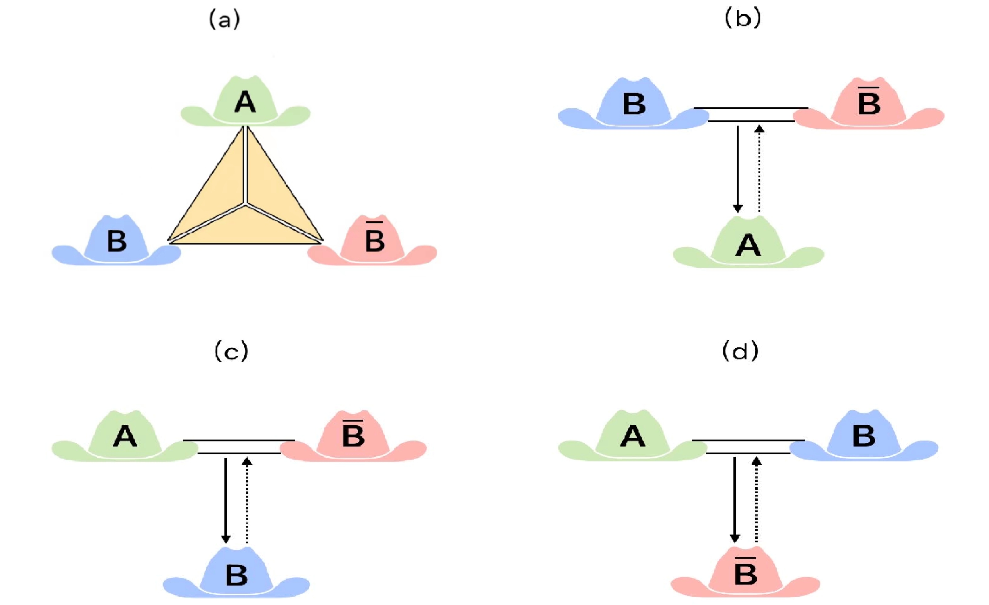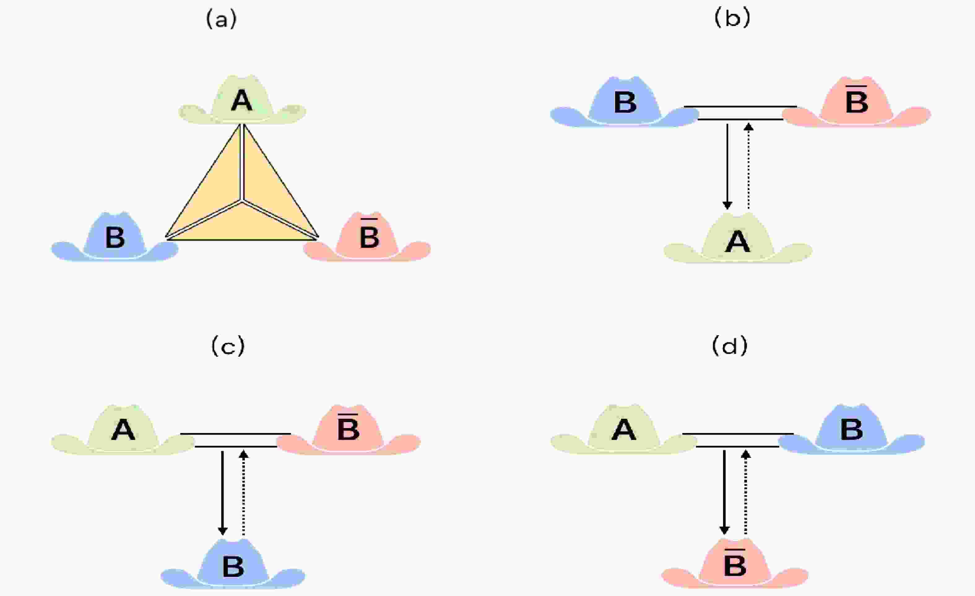 Figure 1. (color online) (a) Genuine tripartite steering. (b)−(d) 2 → 1 steering and 1 → 2 steering.