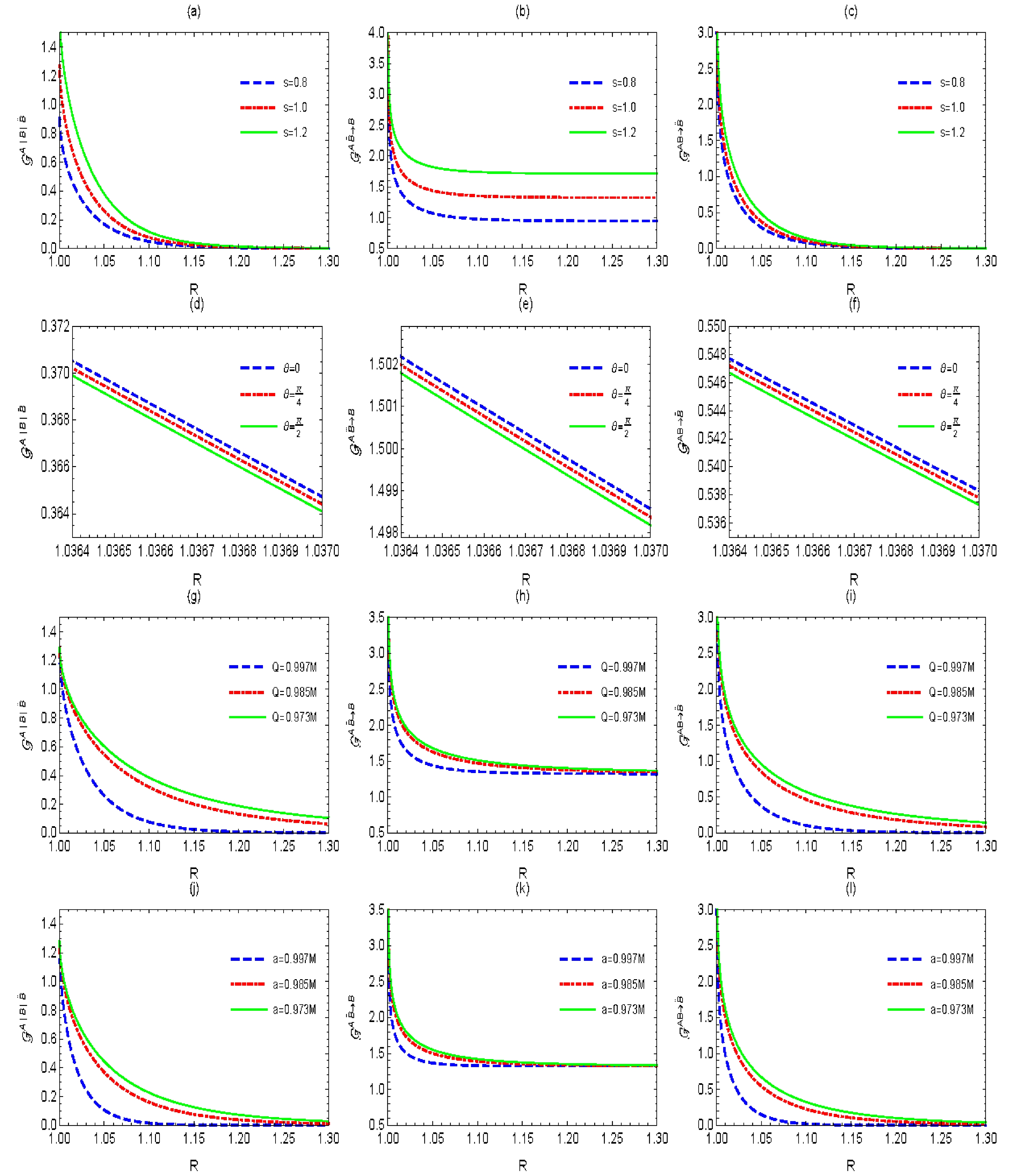 $ a=\dfrac{1}{20}M $ ,$ \theta=0 $ , and$ \omega=\dfrac{3}{4\pi} $ . (b)−(f) We fix s=1, M=1, Q=0.997M,$ a=\dfrac{1}{20}M $ , and$ \omega=\dfrac{3}{4\pi} $ . (g)−(i) We fix s=1, M=1,$ \theta=0 $ ,$ a=\dfrac{1}{20}M $ , and$ \omega=\dfrac{3}{4\pi} $ . (j)−(l) We fix s=1, M=1,$ \theta=0 $ ,$ Q=\dfrac{1}{20}M $ , and$ \omega=\dfrac{3}{4\pi} $ . -