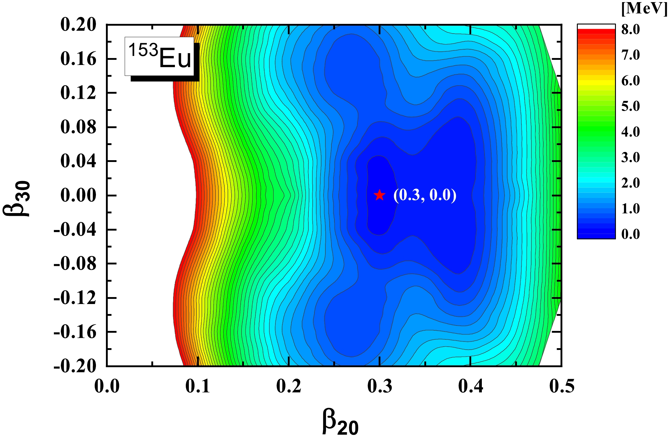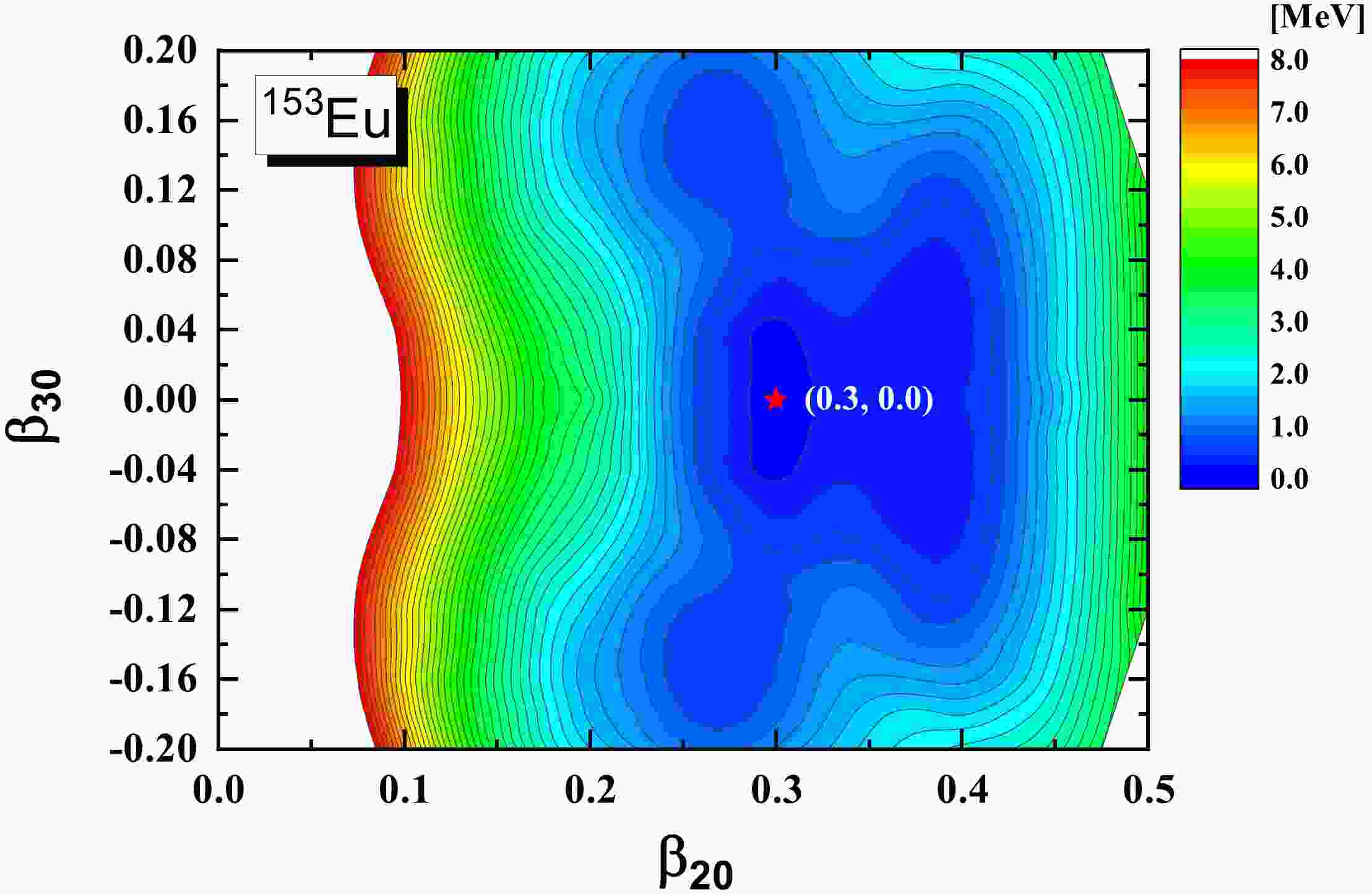 $ ^{153} {\rm{Eu}}$ are based on the microscopic covariant density functional theory (CDFT) in a 3D lattice [40] with the successful point coupling density functional PC-PK1 [41]. Figure 1 shows the potential energy surface (PES) in the$ (\beta_{20}, \beta_{30}) $ plane for$ ^{153} {\rm{Eu}}$ calculated by the constrained CDFT in 3D lattice calculations. The global minimum of the PES is found to be located at$ \beta_{20} = 0.30 $ and$ \beta_{30} = 0.00 $ . All the axial asymmetric deformations, i.e.,$ \beta_{2\mu}, \beta_{3\mu},\beta_{4\mu}, (\mu\ne0) $ , are found to be zero, which means that the ground state of$ ^{153} {\rm{Eu}}$ corresponds to an axial and reflection symmetric shape. The PES exhibits a relatively soft character around the minimum. With the above adopted deformation parameters, a unified description for the positive- and negative-parity bands and the electromagnetic transitions between them in$ ^{153} {\rm{Eu}}$ can be obtained. In addition, the RAT-PRM calculations with$\beta_{30} = 0.03, 0.05$ , and$ 0.07 $ are also performed to investigate the effect of octupole deformation.For the intrinsic part, the reflection asymmetric triaxial Nilsson Hamiltonian with the parameters