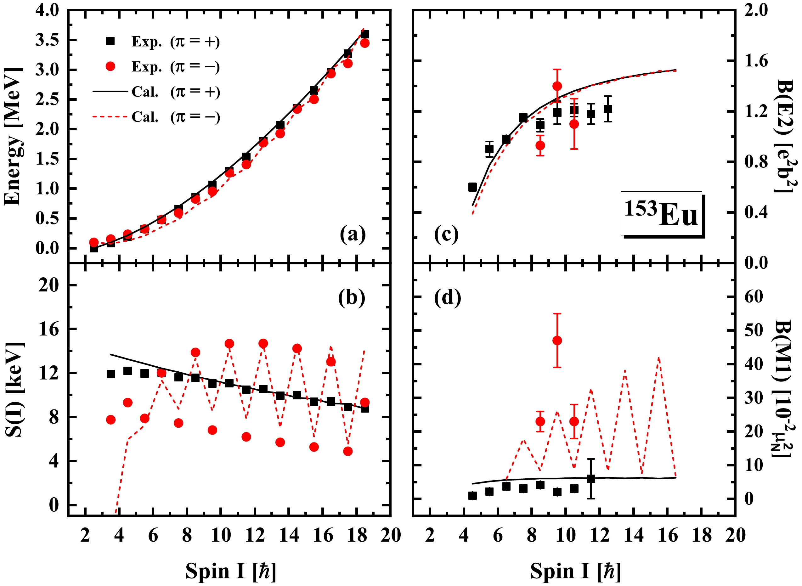 $E(I)$ (a), the energy staggering parameters$S(I)=[E(I)-E(I-1)]/(2I)$ (b), and the intraband$E2$ (c) and$M1$ (d) transition probabilities for the positive-parity band$\pi=+$ and negative-parity band$\pi=-$ in 153Eu calculated by RAT-PRM (lines), in comparison with the experimental data [19] (symbols).As shown in Fig. 2(a), the experimental positive- and negative-parity bands are nearly degenerate in energy. The negative-parity band is situated at a slightly higher level in the bandhead vicinity. As the spin increases, it undergoes a downward shift with respect to the positive-parity band, reaching a point of intersection at