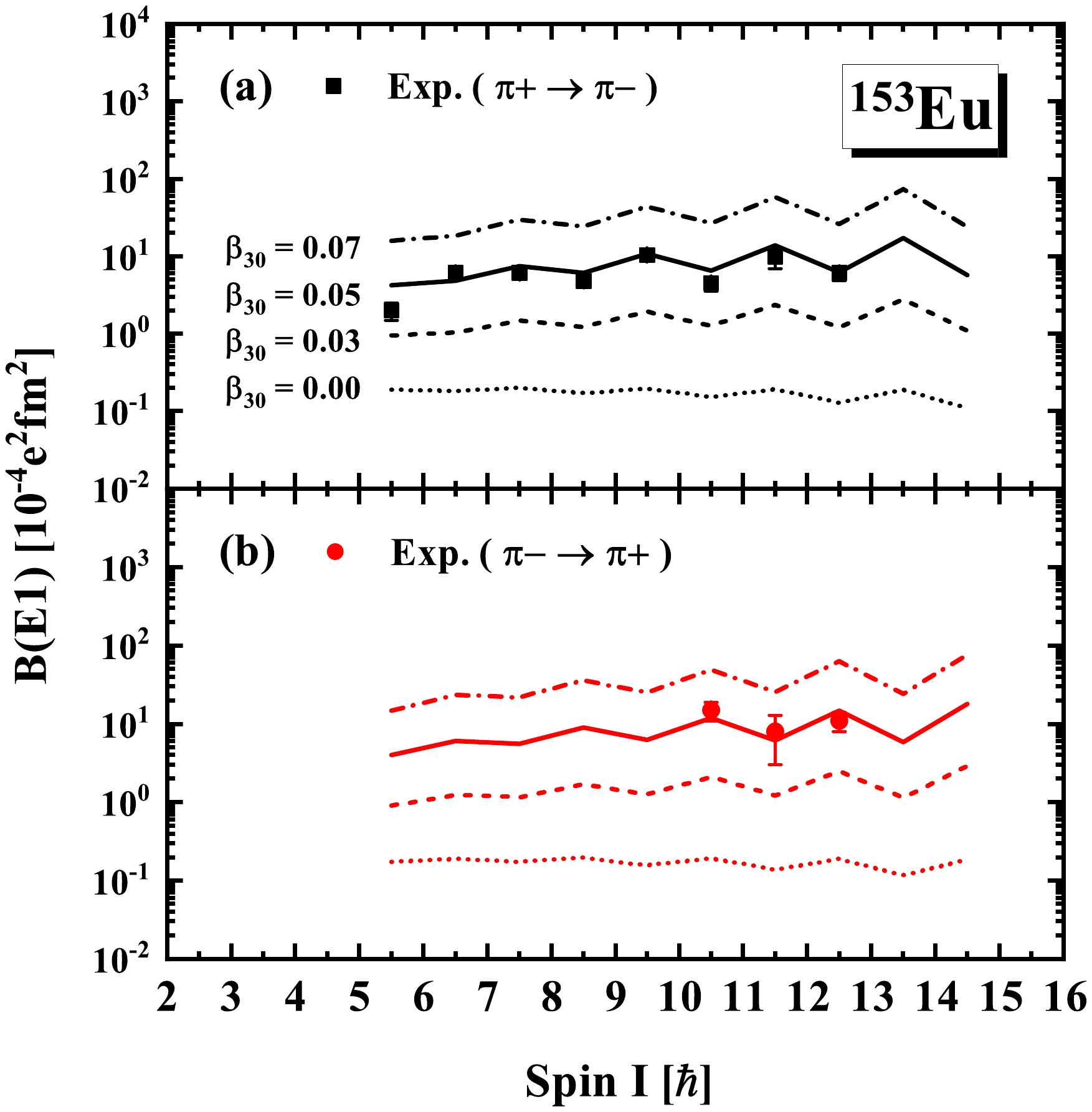 $B(E1)$ values of the interband$E1$ transitions in 153Eu in comparison with the available experimental data [19] for (a) the positive-parity to negative-parity bands ($\pi+\rightarrow\pi-$ ) and (b) the negative-parity to positive-parity bands ($\pi-\rightarrow\pi+$ ). The RAT-PRM calculations with$\beta_{30}=0.00, 0.03, 0.05,$ and$0.07$ are denoted with different lines.To determine the roles of the two terms in Eq. (3), Figs. 4(a) and (b) show the calculated