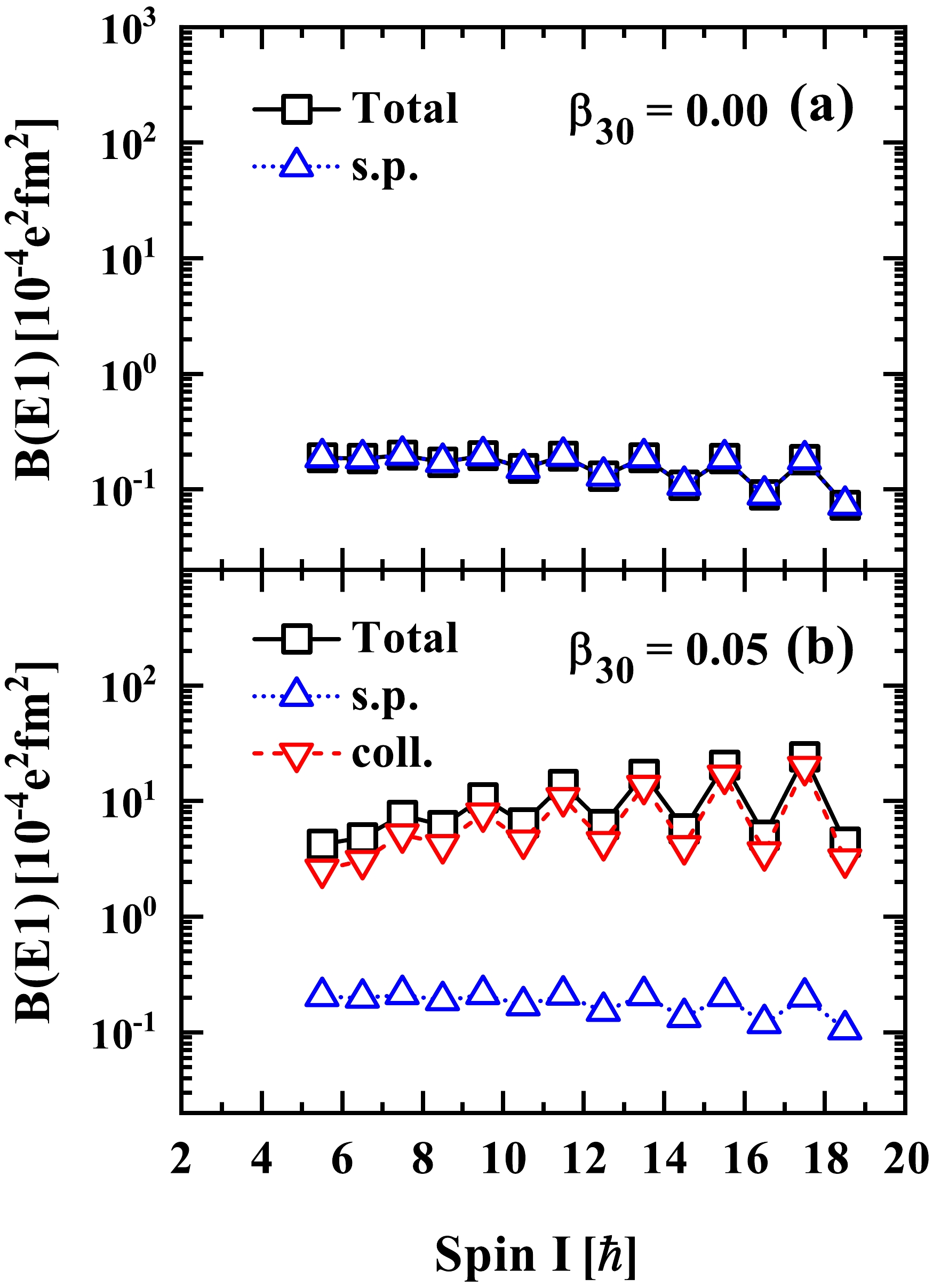 $B(E1)$ values for the interband$E1$ transitions from the positive-parity to negative-parity bands in 153Eu for (a)$\beta_{30}=0.00$ and (b)$\beta_{30}=0.05$ . Calculated$B(E1)$ values using only the first term of Eq. (3) (labeled as coll.) and only the second term of Eq. (3) (labeled as s.p.) are denoted by the upside down and up triangles, respectively. The total$B(E1)$ values (labeled as Total) are denoted by open squares. For$\beta_{30}=0.00$ , the collective part vanishes.The main components of the RAT-PRM wave functions in terms of the strong coupled basis