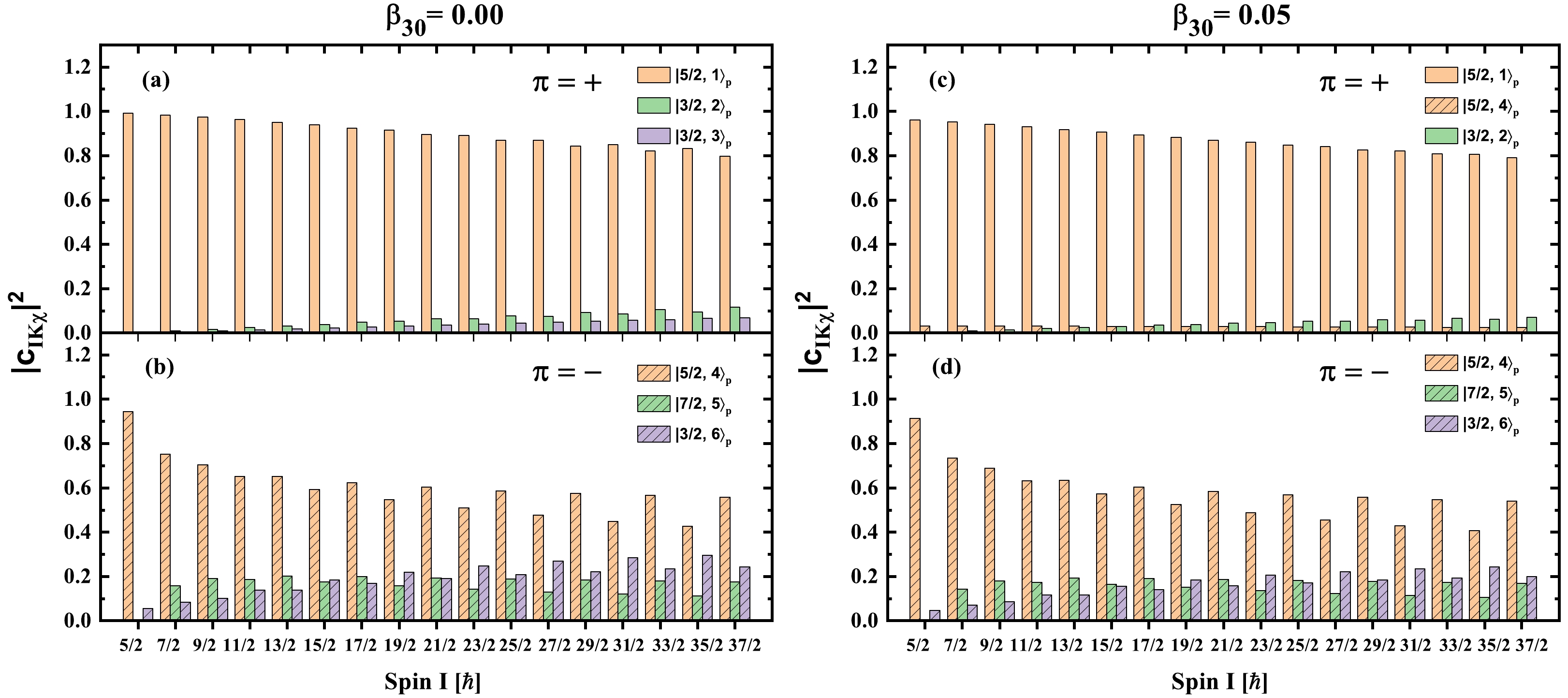 $|IMK\rangle\chi^\nu_p$ (denoted as$|K,\nu\rangle_p$ for short) for (a) & (c) the positive-parity band$\pi=+$ and (b) & (d) negative-parity band$\pi=-$ within spin region$\frac{5}{2}\hbar \le I\le \frac{37}{2}\hbar$ with$\beta_{30}=0.00$ (left plane) and$\beta_{30}=0.05$ (right plane).$|IMK\rangle$ is the Wigner function with I, M, and K being the quantum numbers of the total angular momentum and its projections along the third axis in the laboratory frame and intrinsic frame, respectively. The$\chi^\nu_p$ represent the intrinsic wave functions of the proton single-particle level$|\nu\rangle_p$ obtained by diagonalizing the reflection-asymmetric Nilsson Hamiltonian.To understand why the octupole deformation